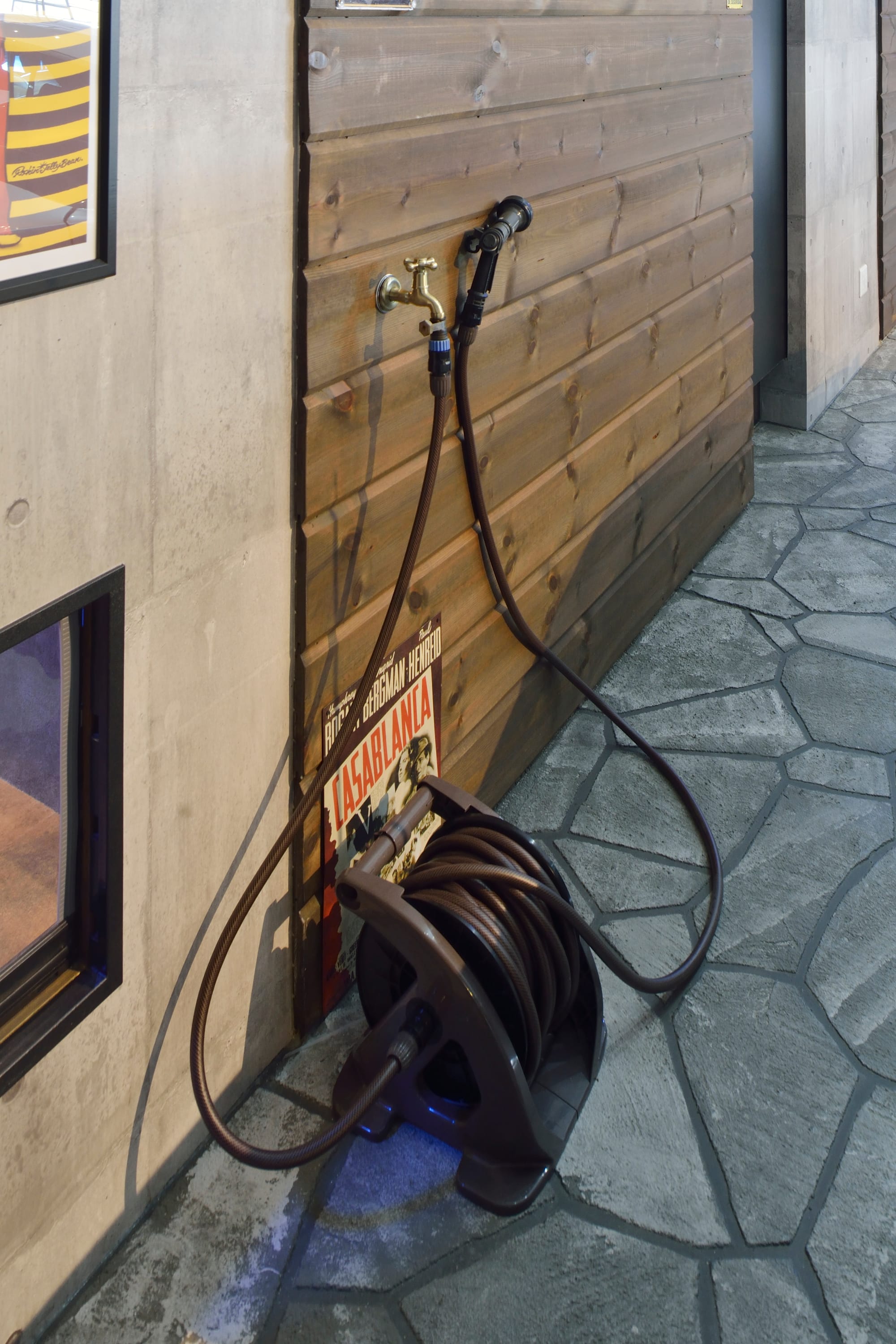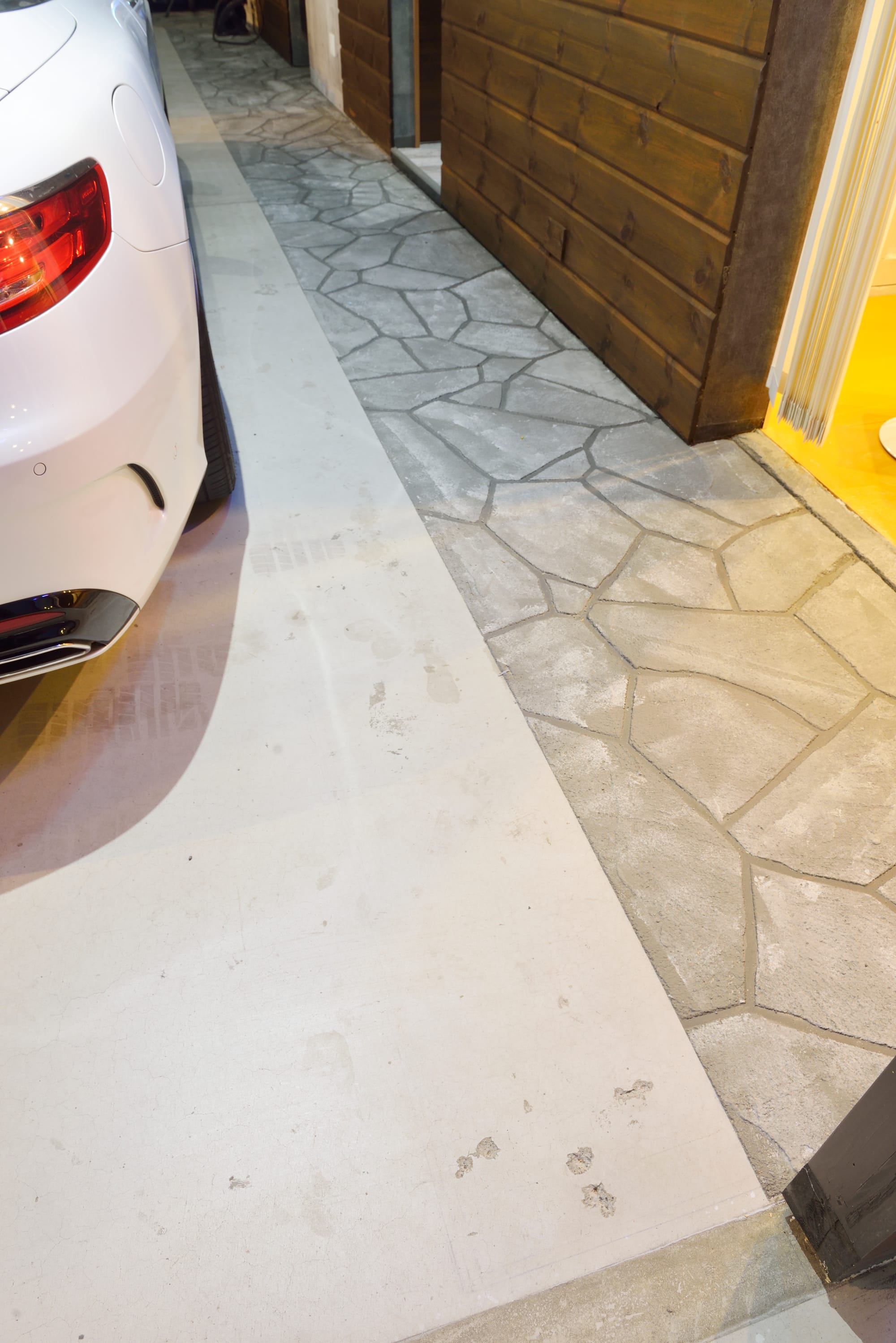 左/クルマの洗車ができるようにガレージ内にも水回りのスペースを確保。 実際の洗車はガレージの外で行なうそうだ。 下/ガレージスペースのほとんどがモルタル仕上げであるが、アクセントとしてローラーストーンを施工。ローラーストーンとは特殊先行技術により本物の石張りのように床面を表現する耐久性のある仕上げ。
