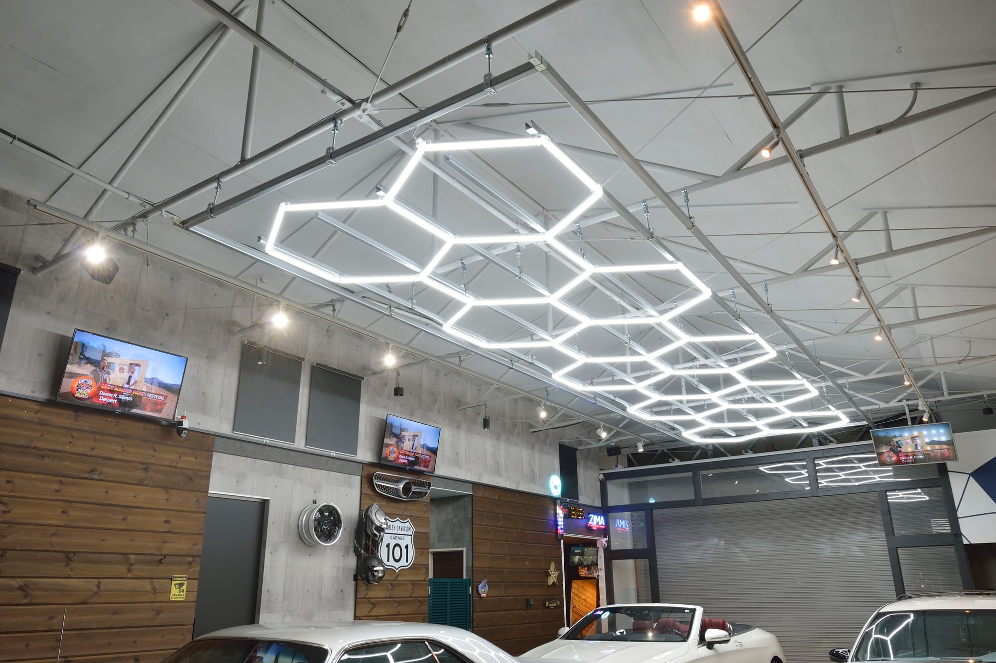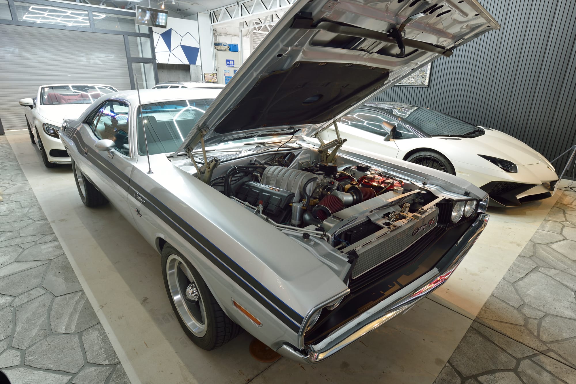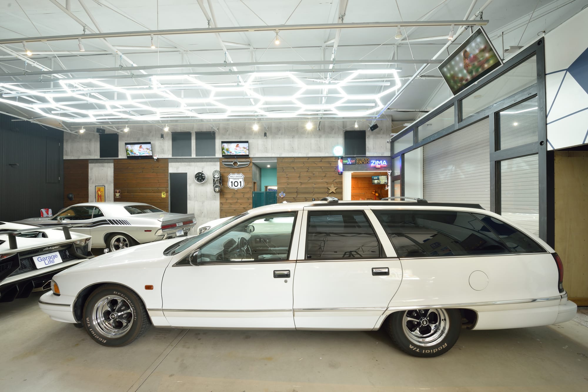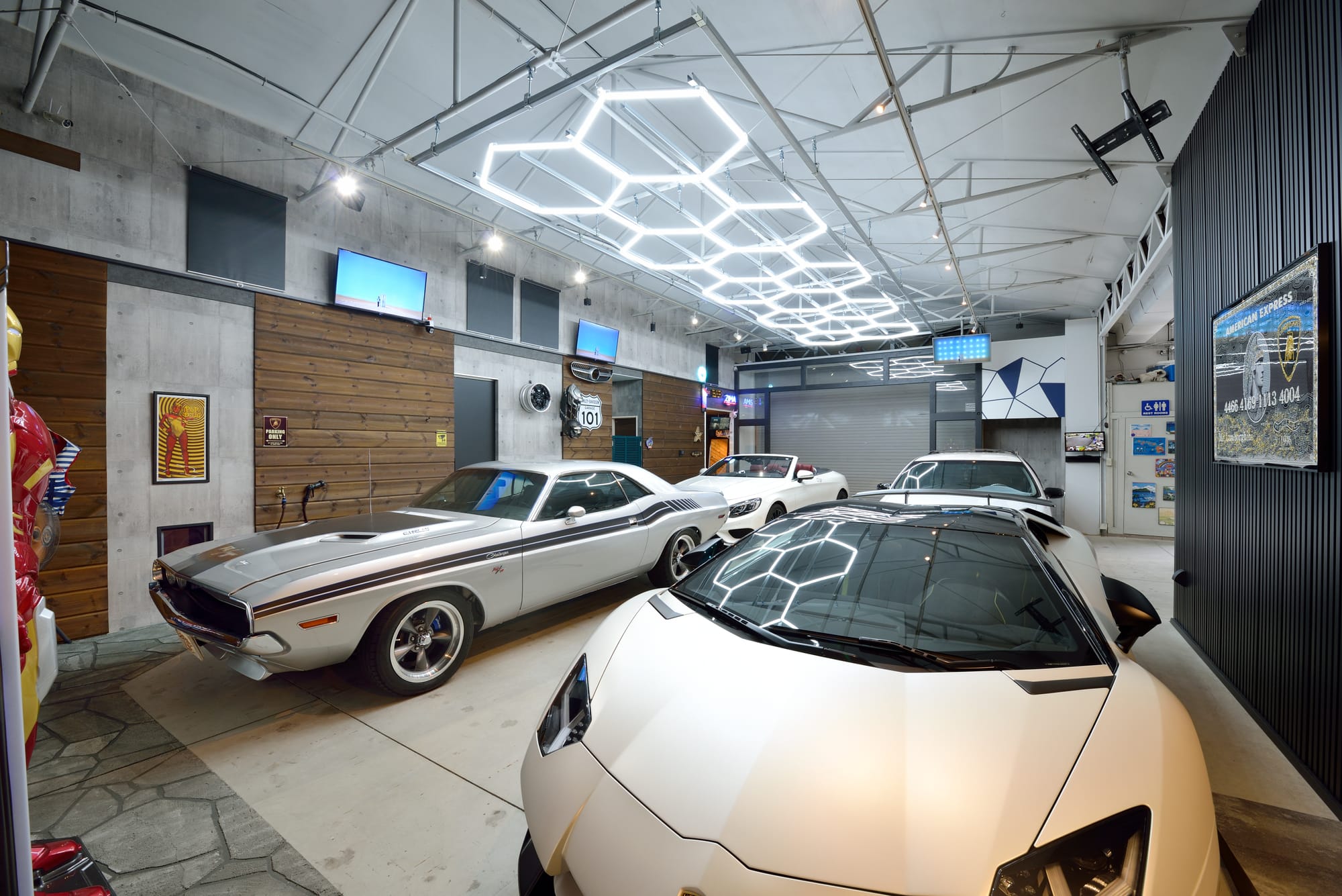 コンセプトはアメリカのブルックリンのようなレンガやコンクリートが剝き出しの開放的なスタイルの秘密のガレージ。300 坪の敷地に建築された約40 年前に建てたスレートのシャッターを開けるとIさんの愛車、1970 年式ダッジ・チャレンジャー、1996年式シボレー・カプリスワゴン、2017 年式メルセデス・ベンツS クーペ、2017 年式ランボルギーニ・アヴェンタドールSV ロードスターが格納されている。