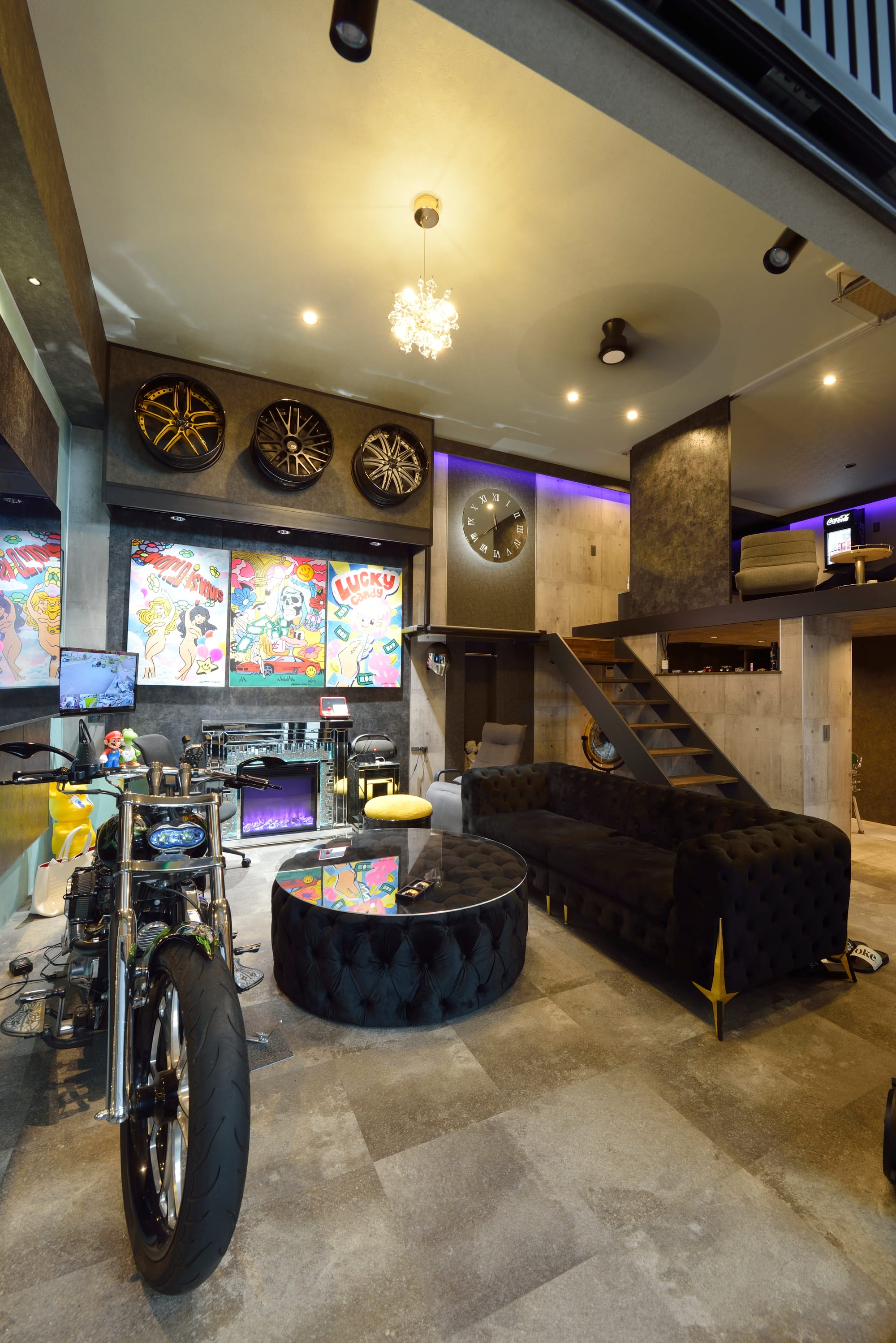 倉庫として使用していたスペースも、仕切りの壁面を造作して遮熱対策をすることでオフィス兼書斎とすることとで居住スペースを確保。Iさんいわく、「クルマを眺めるスペースが確保できたのは思い描いていた空間ですね」と語る。取材日には名古屋のナイトクルーズで知り合った『TM Connection』の玉田さんも駆けつけ、今後のガレージプランについても打ち合わせ。各部屋にはモニターが設置され、ミュージックビデオや音楽なども楽しめる。ロフトスペースにはゲームによるドライビングも楽しめるなど遊びのためのミッチーワールドが広がってた。