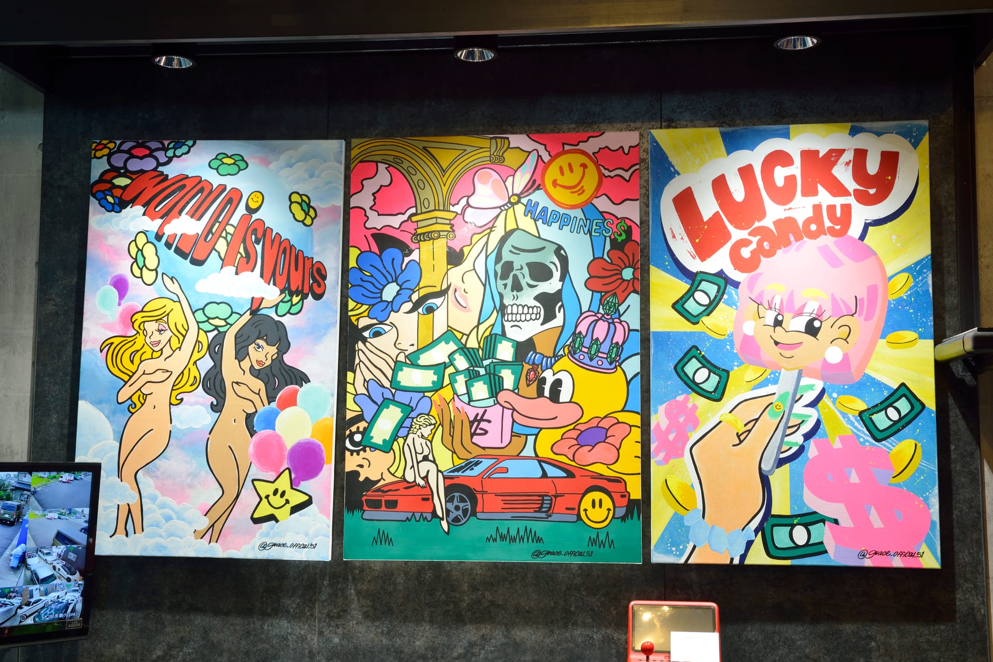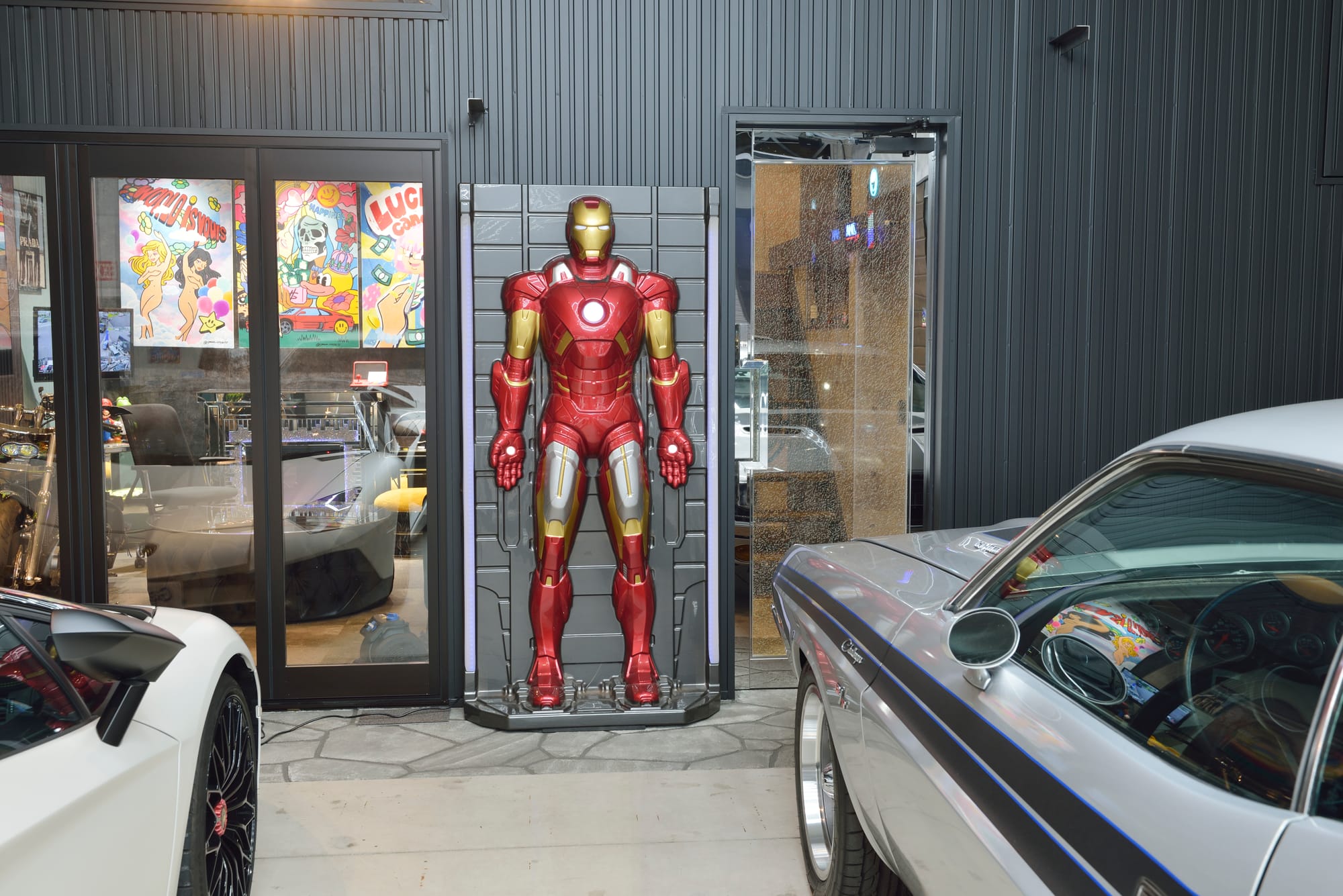 左/『セーフティーライフ』から譲り受けたというアイアンマンは等身大。ガレージの顔をとしてディスプレイされる。 右/ミッチーさんが推しのアーティスト、GRACEさんの巨大な作品をプライベートスペースにディスプレイ。日本で活躍する新鋭アーティストの活動は@grace_official_51でチェック。