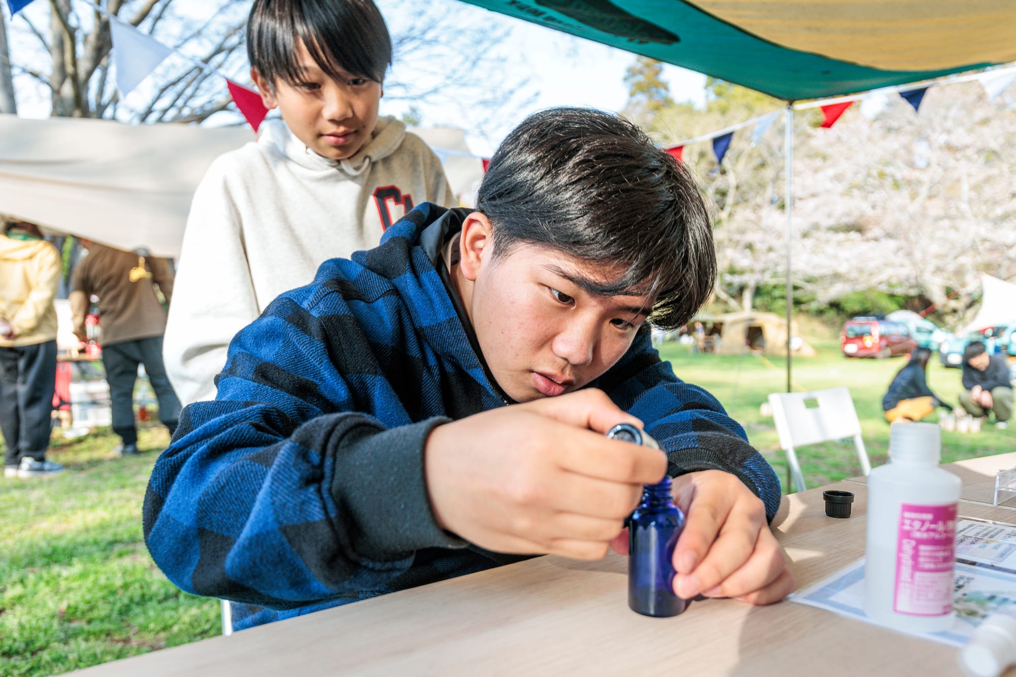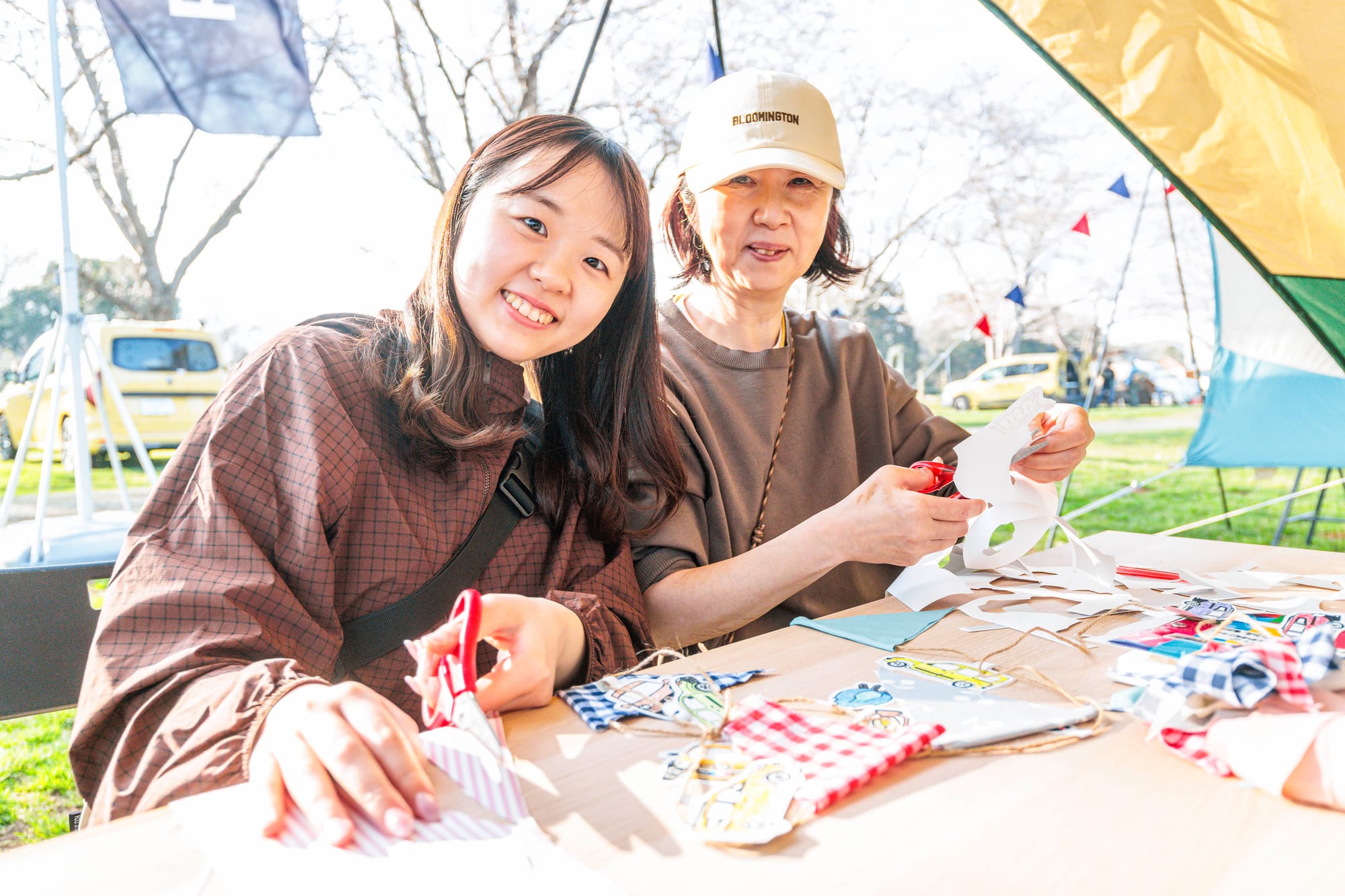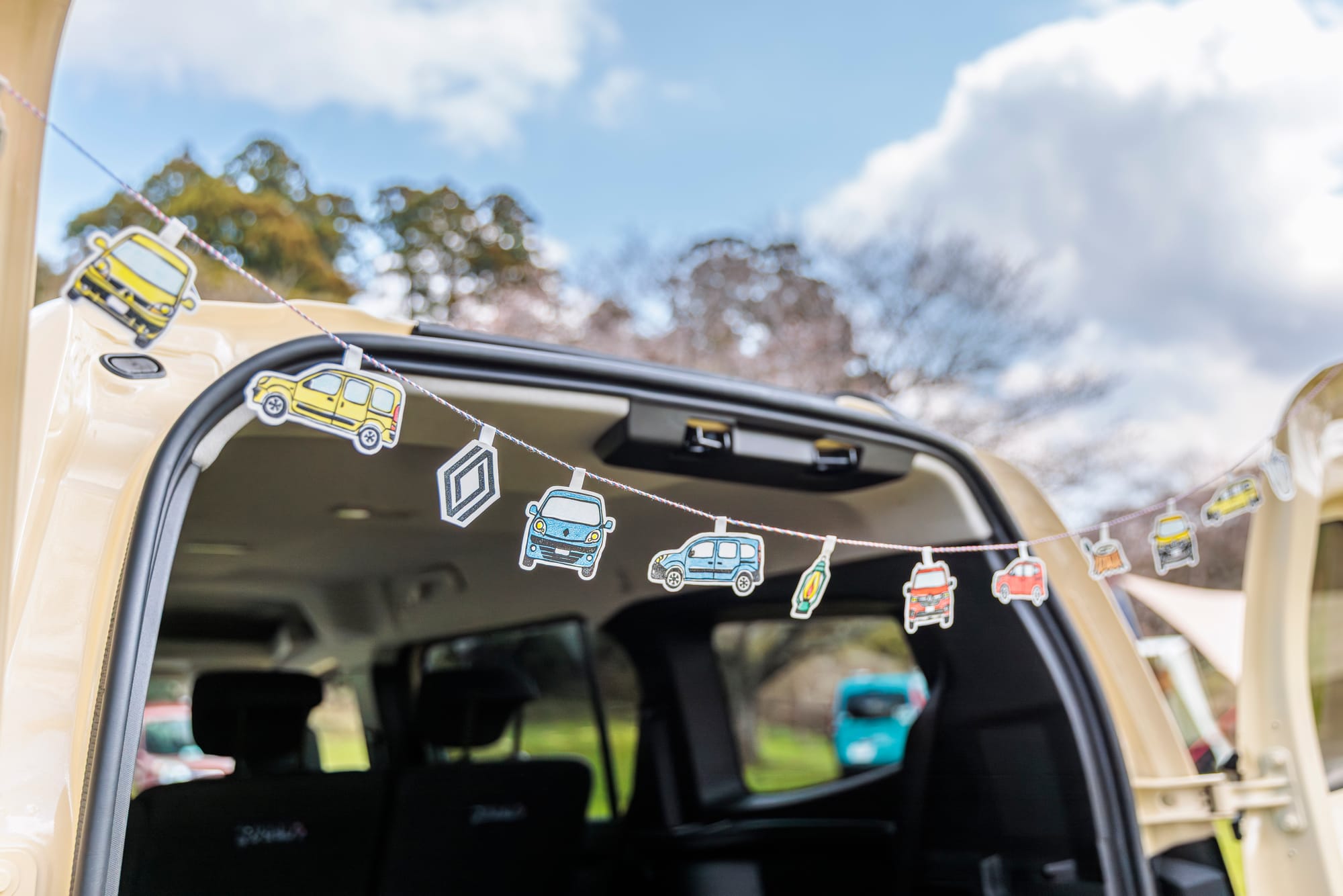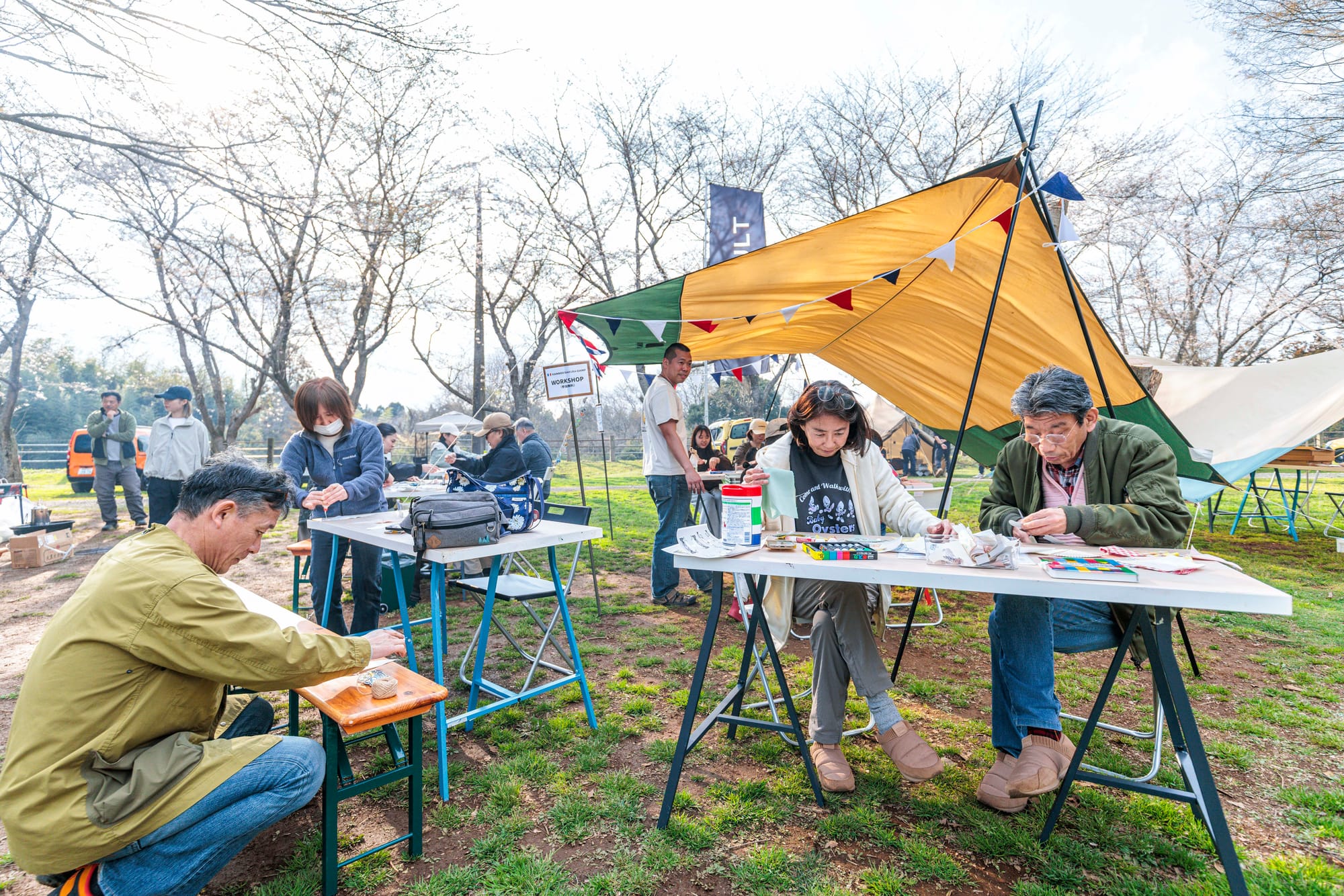 午後には気温が上がって続々と桜が花開き、まさにこの時期にしか体験できないお花見キャンプの様相に。新着の特別仕様車グランカングー・クルールの展示エリアでは、3列7人乗りの室内に乗り込んで興味深くチェックする参加者も多くいて、その隣に設営されたアウトドア・ワークショップでは、のりものハンコ作家・松山倫子さんのイラストによるカングー・オリジナルのガーランド製作や虫よけアロマづくり、Goods Press編集部によるフィンランド発祥のスポーツ「モルック」体験といったアクティビティも楽しめたようだ。