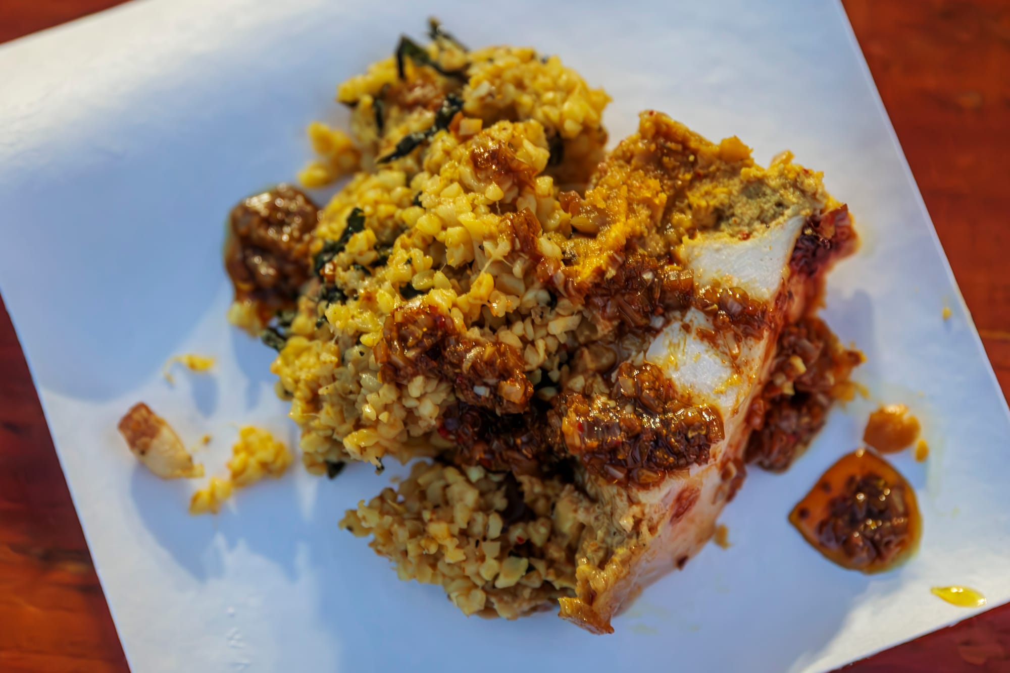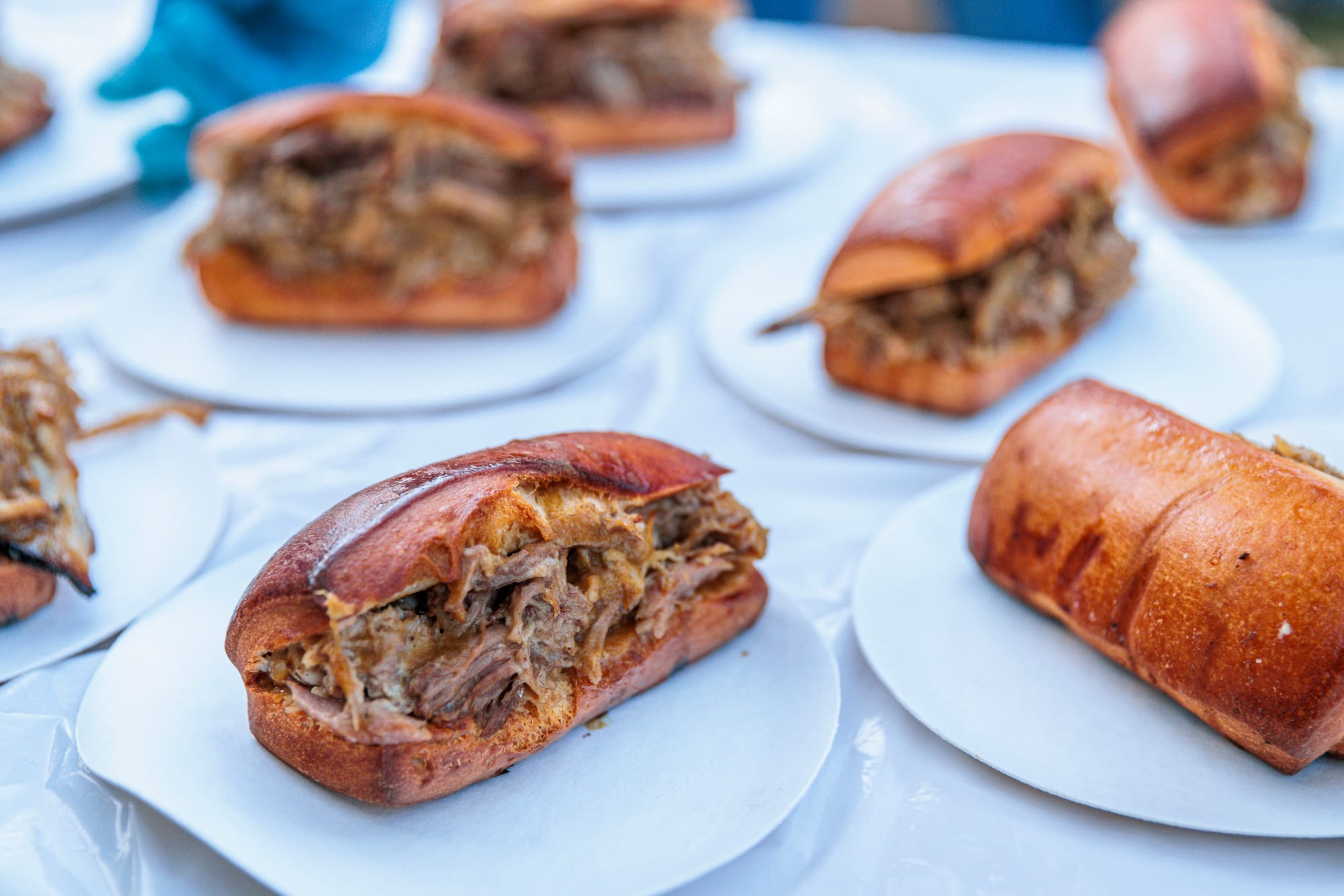 ほろほろの豚肉を挟んだサンドイッチからブルグルを添えたグリルチキン、シェフのお手製ソーセージとマッシュポテトの3皿が提供された。