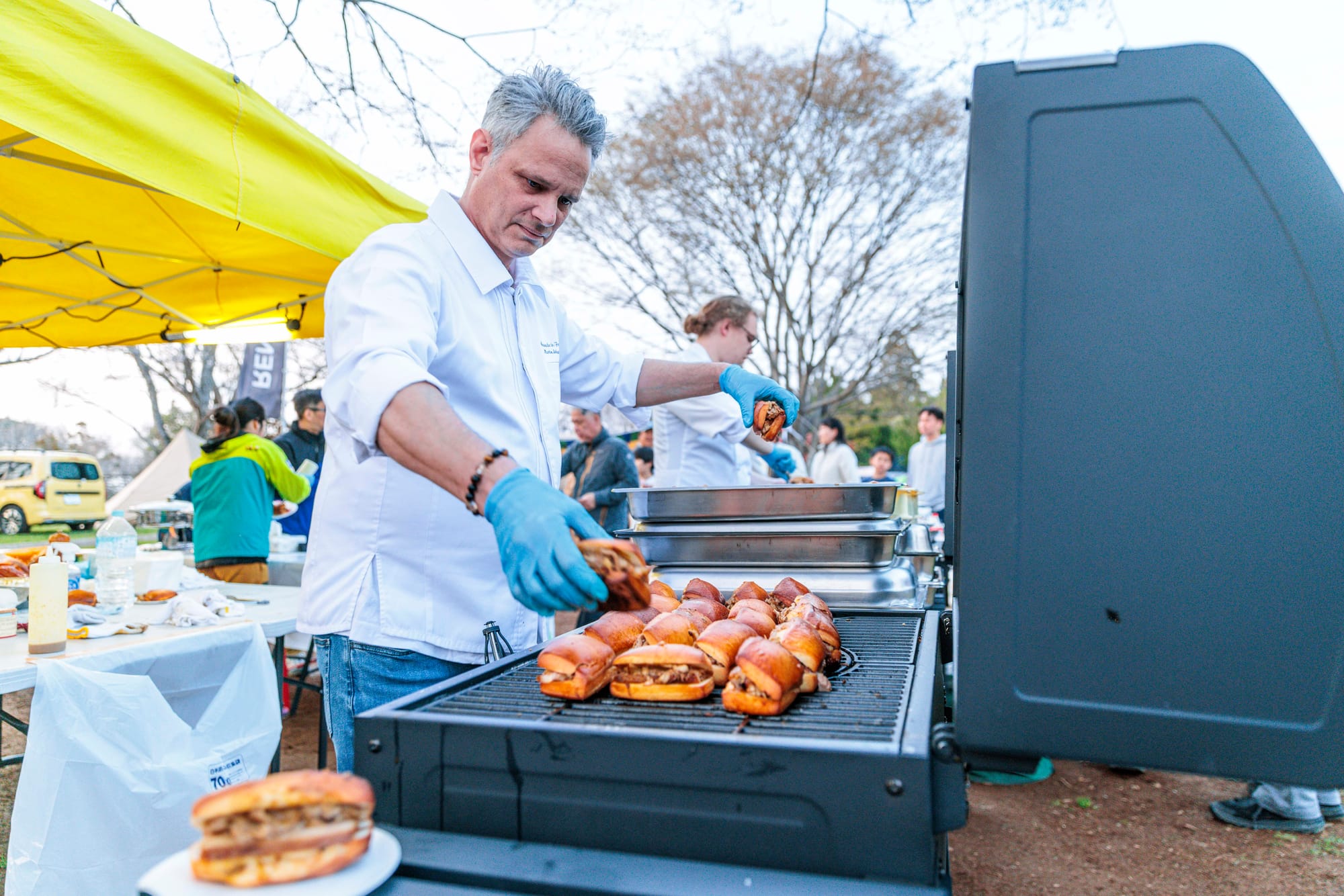 そして夕方からのフレンチスタイルBBQタイムには、マクロン大統領夫妻の来日直前にも関わらず、在日フランス大使館のセバスチャン・マルタン総料理長が成田まで駆けつけてくれた。大型グリル2基を駆使して調理された肉料理にじっくり仕込んだであろう絶品ソースが添えられたメニューはどれもお見事! みなさんの笑顔からも大満足ぶりがうかがえた。