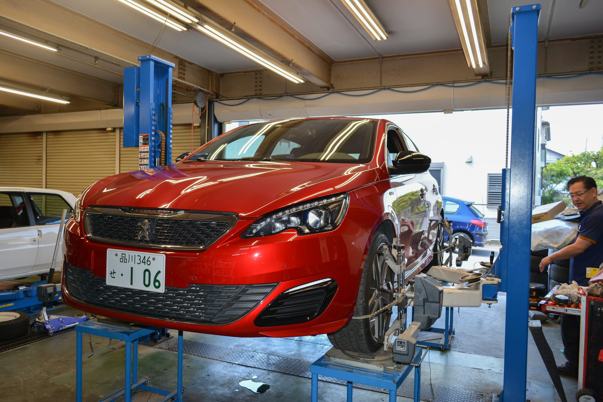 アイバッハ製スプリングを入れてアッパーマウントもリフレッシュした、長期リポートカーのプジョー308GTi270(T9型)は、路面のゼブラや細かいピッチといった情報を伝えながらも、基本的にはフラットで快適かつシャキっとしたフィーリングが好感触。その後1000Kmほどのナラシでパーツがなじんだ頃合いということで、各所のチェック&調整のために埼玉のオート・ポワ・ルージュを訪れた。 わずか20㎜とはいえスプリング交換で車高がダウンしているので、まずはヘッドライトの光軸調整から。保安基準がロービーム(すれ違い前照灯)に変わるのを機に、LED対応の最新ヘッドライトテスターを導入した大竹代表は、「高いから元とるまで大変だよ」と言いつつもサクサクっと作業完了。 続くホイールアライメント調整は、4輪にレーザー式測定器をつけてステアリングを治具で固定し、モニターに表示されたモデル/グレードごとの適正値までタイロッドを調整していく。リヤがトーションビームの前輪駆動プジョーの場合はフロントのトー角調整でOKだが、「サスペンションはもちろん、タイヤ交換の後もアライメントはチェックした方がいいよ」とのこと
