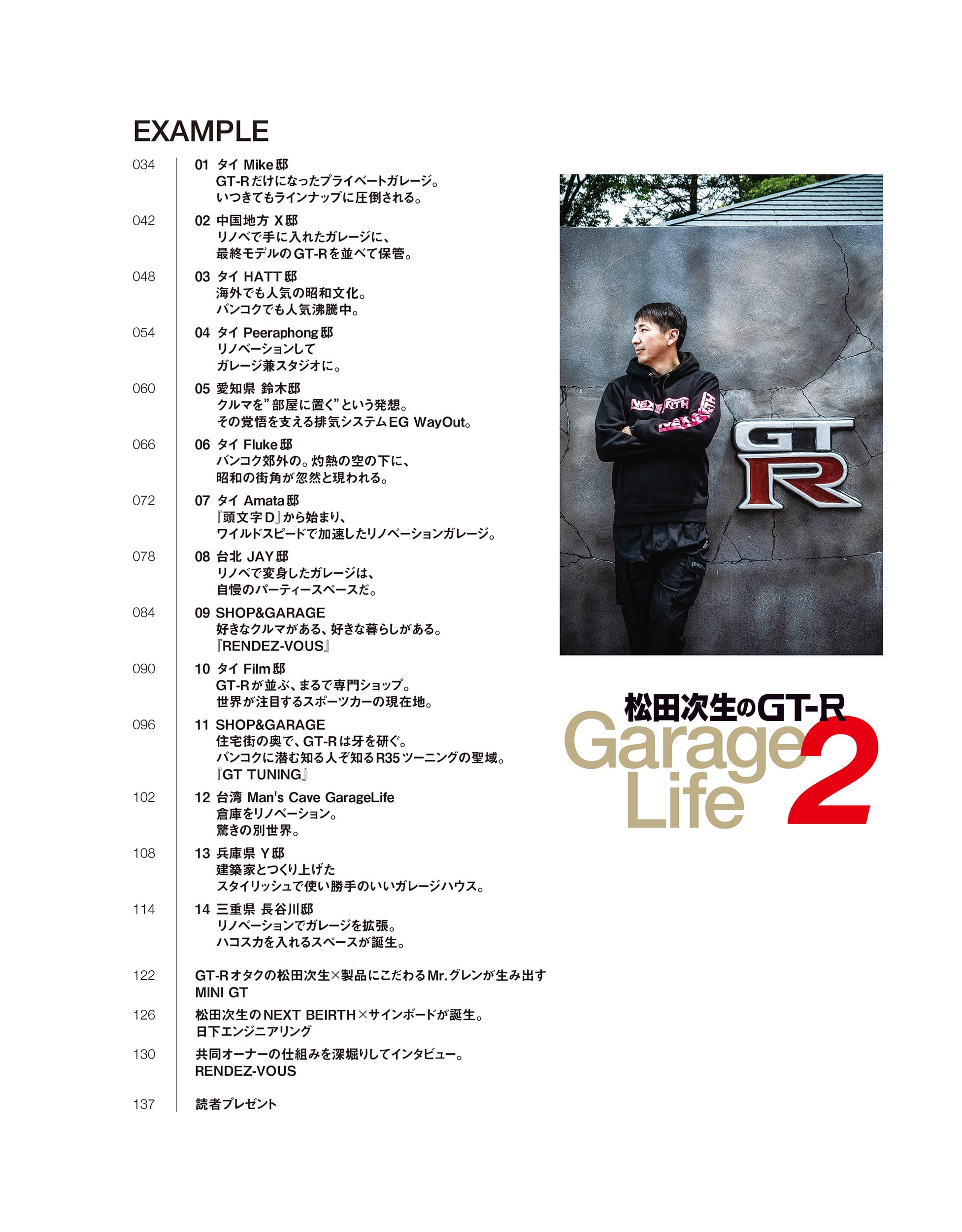 スペシャル対談としてMINI GT、日下エンジニアリング、REBDEZVOUSの社長との対談も収録。GT-Rファンをはじめ、松田次生さんのファン、GarageLifeのファンまで楽しめる内容の濃い1冊をお届けする。