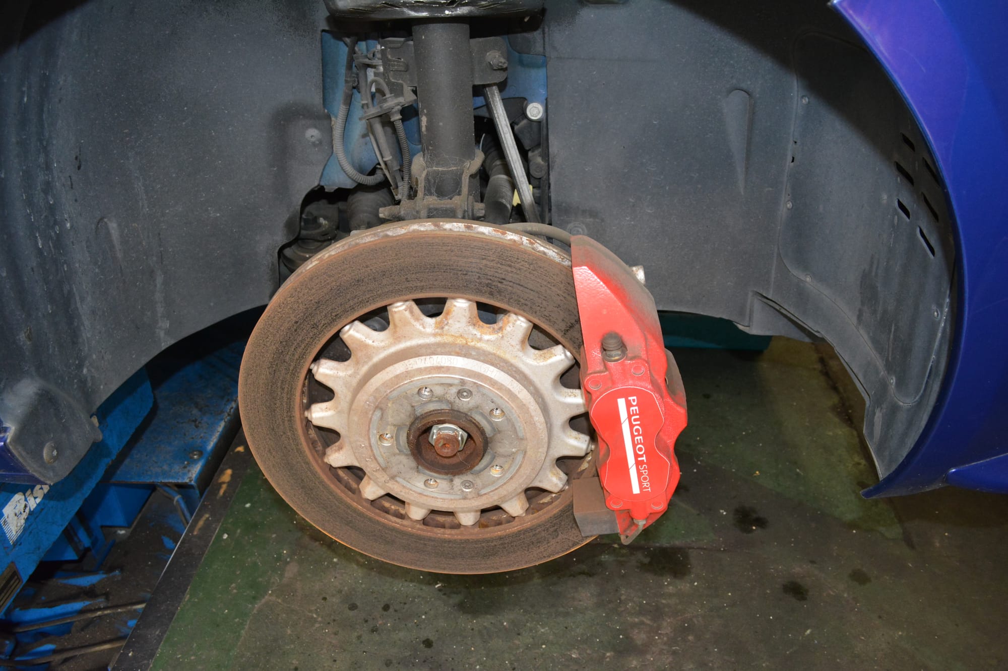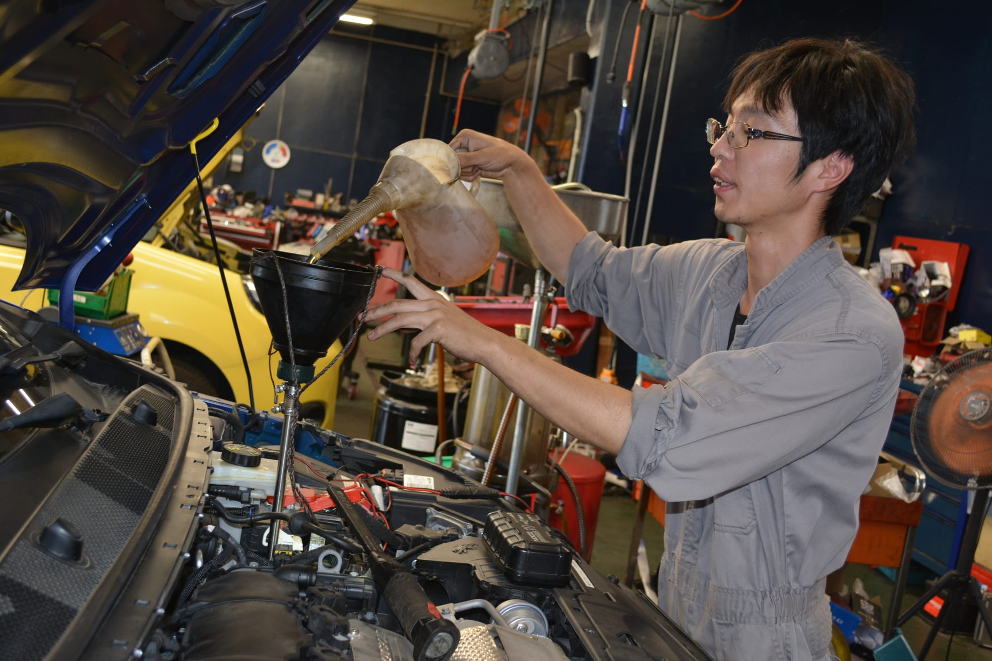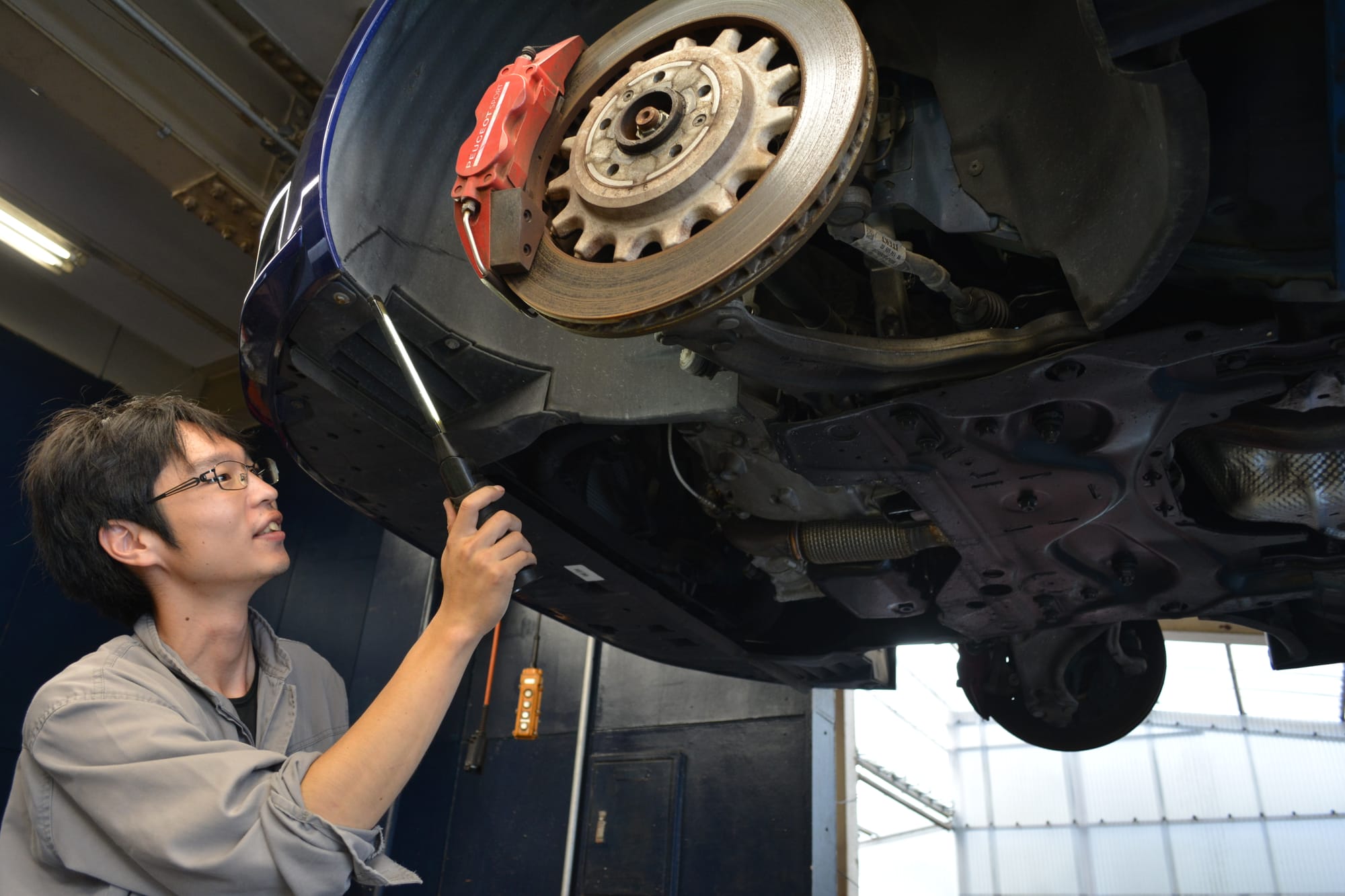 2017年式 のT9前期型は走行距離3.5万Kmチョイで、マグネティック・ブルーのボディもヤレてないようだが、まずはリフトアップしてフレームや足回りにダメージがないかを確認。エンジン&ミッション・オイルやベルト類、フィルターといった消耗部品の交換は基本とのこと。ただし、エアフィルターやギアオイルの交換にはインテークパイプの脱着が必要だし、ブレーキパッドやスパークプラグも交換となれば、適合部品の手配はもちろん、プジョーの気まぐれで独特な構造も考えればDIY整備は避けたい。