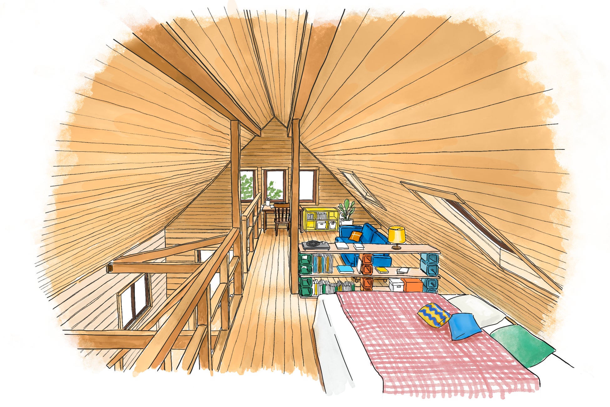ログハウスならではの斜め天井と天窓がポイントの、秘密基地のようなロフトスペース。開放的な吹き抜けともつながり、光が差し込む明るい空間。
