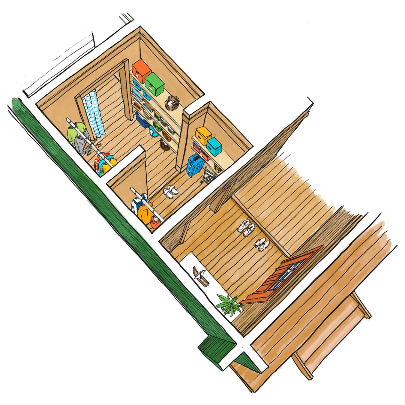 遊びごころをテーマにしつつ、合理的な一面も。玄関からひとつながりの収納スペースとウォークインクローゼットは、水まわりともつながっていて、生活動線がスムーズで使い勝手のいい間取り。