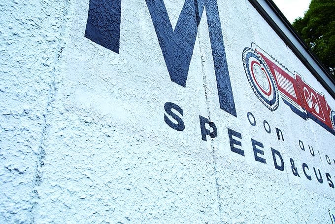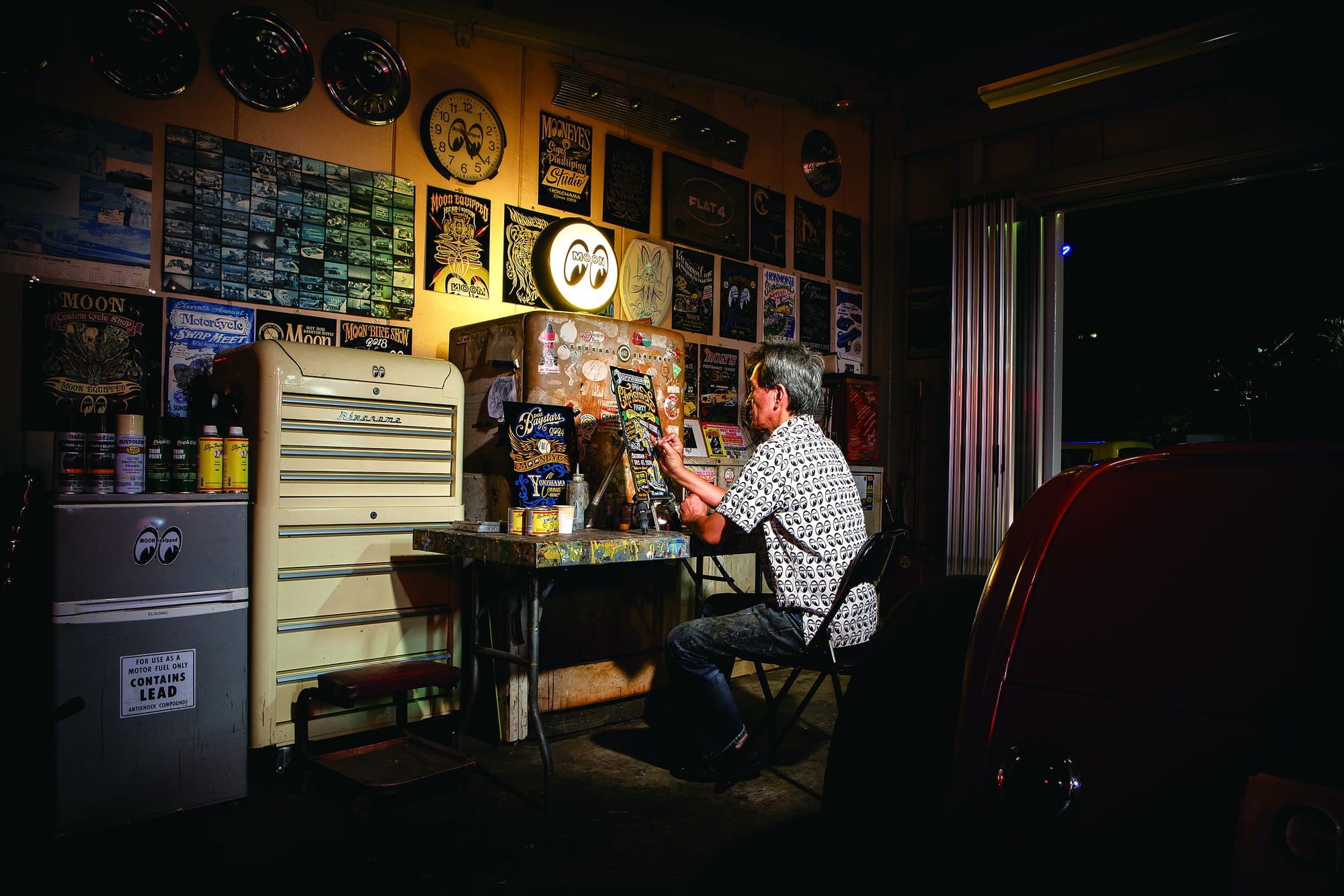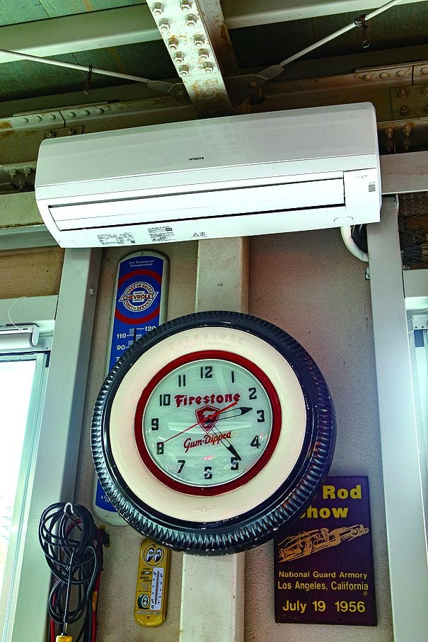 であればだれもが憧れるスタイルで、夢を抱かせるスペースとなっている。このスペースはMOONEYESが所有するクルマが展示されるほか、軽作業を行なえるスペースとなっている。また日本を代表するピンストライパー・ワイルドマン石井氏のスタジオも兼ねている。しかしここ数年の猛暑では作業ができないという問題が生じていたため、またワイルドマンの還暦祝いも兼ねてクーラーの導入工事とともに、シャッターをショールームのようなスケルトンの横引きシャッター・ルミエールに変更することに。わずか1週間のガレージ工事が2024 年9月下旬に行われた。