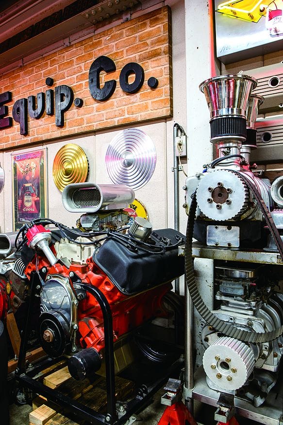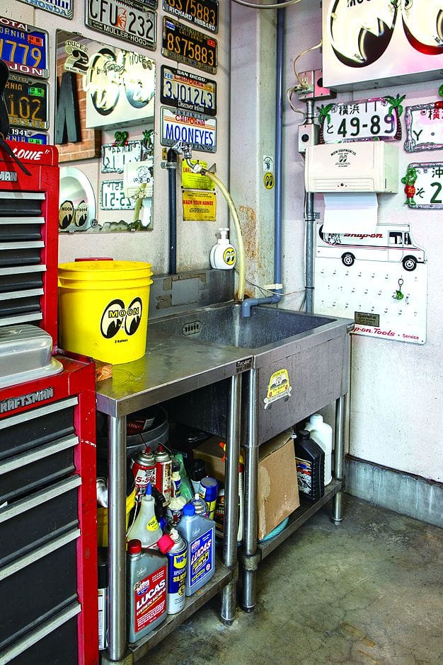 左 /ガレージには水栓が用意され手洗いができるようになっている。油脂類などもこのスペースにストックされている。 中 /待望のエアコンが 新設されたガレージ内。入り口の裏側に設置されたため、外側からは見 えないように。エアコンから発生する結露はパイプが新設されモーターにより吸い上げられている。 右/ガレージに保管されているのはシボレーのエンジンとへミ・エンジン。サブエンジンがストックされている。