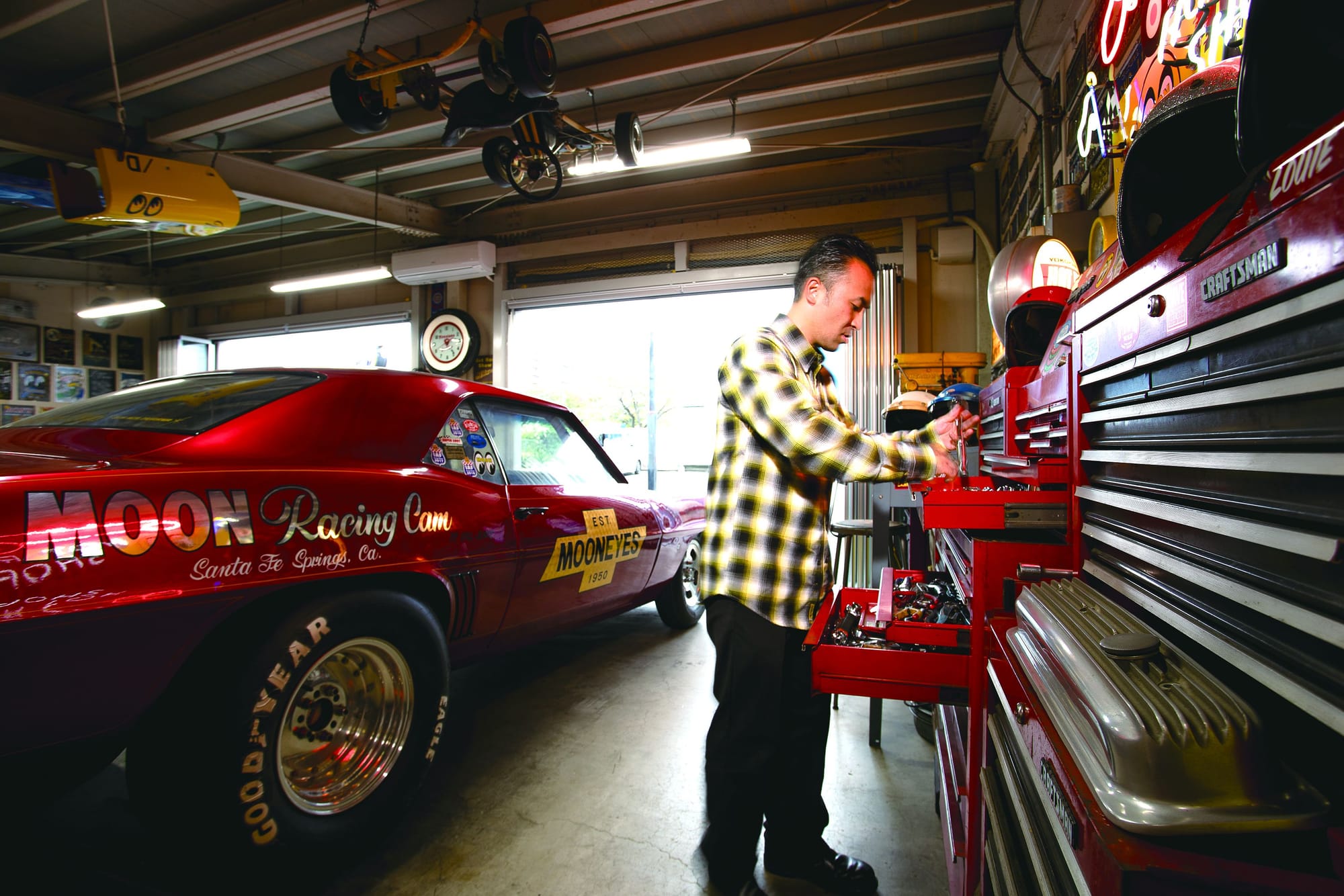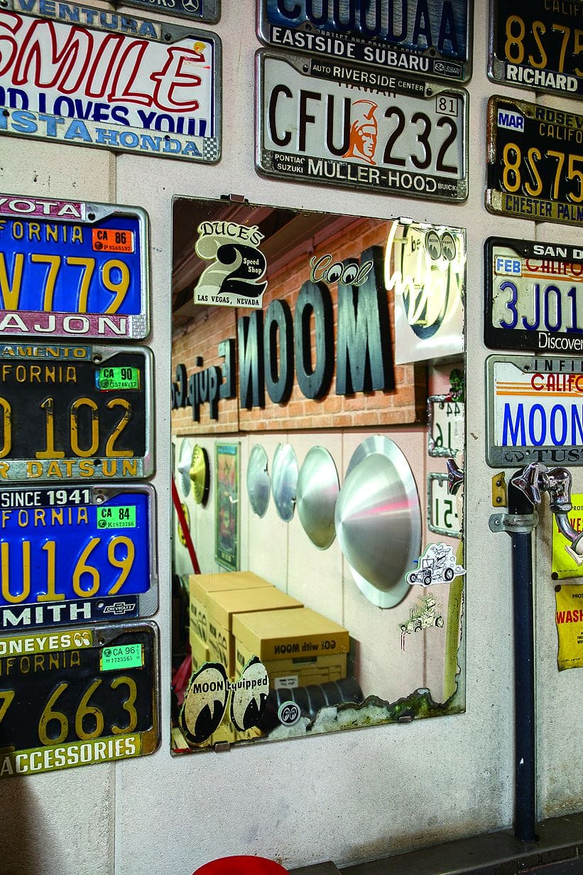 左/ガレージにはSnap-On製TOOLBOXとCRAFTMAN製TOOLBOXを設置。CRAFTMAN製のTOOLBOX は持ち運 びができるためクルマに搭載も可能。壁面にディスプレイされたUSナンバープレートはナンバーフレーム付きもポイントだ。 右/ミラーは故ディーン・ムーンが実際に使用していたミラーには1960年当時のステッカーが貼られている。このカスレ具合まで再現された復刻したミラーが商品化され購入が可能。