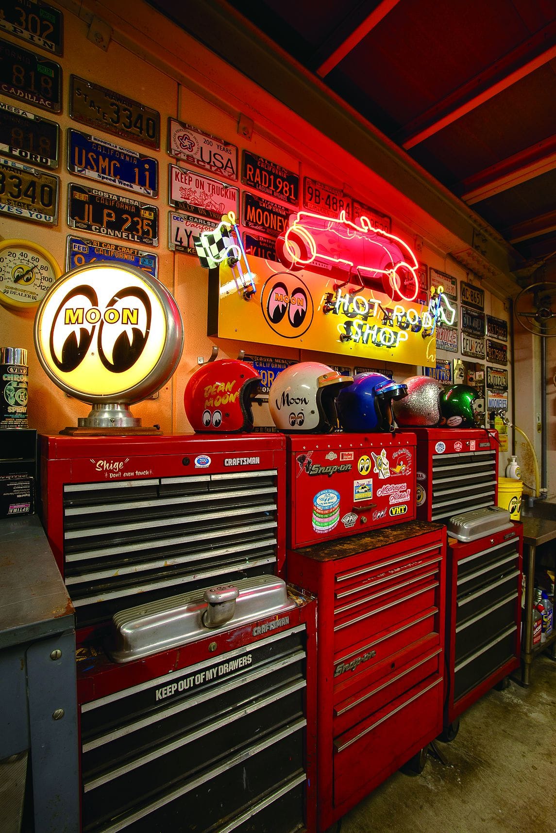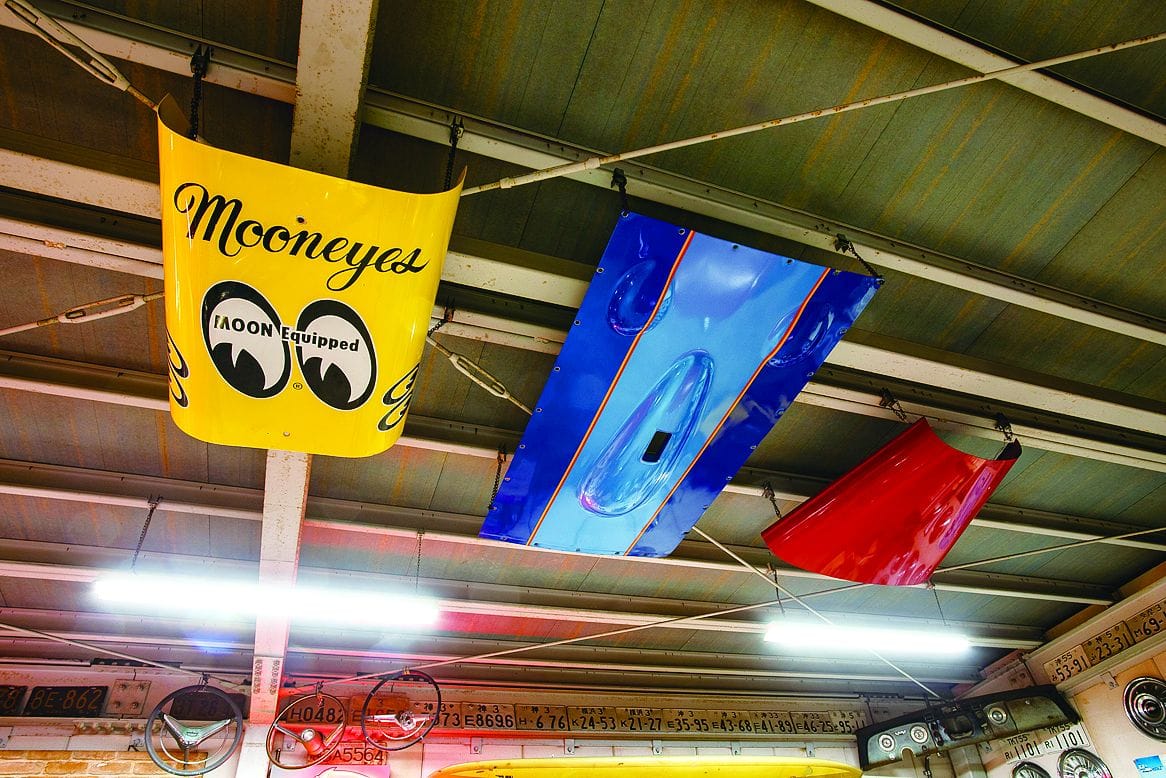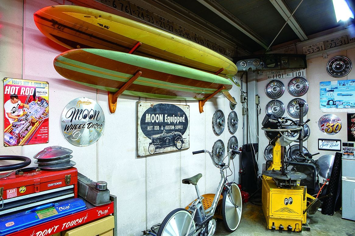左 /デッドスペースになりがちな天井にはボンネビルを走るストリームライナーとドラッグスターのエンジンフードが保管される。ガレージは作業性がいい蛍光灯により明るく 照らされる。 中 /サーフ&ロッドをテーマと掲げるスペースには、ロングボードを2枚ディスプレイ。タイヤチェンジャーがガレージにありタイヤの履き替えもできる。 右 / ガレージの壁面には、『MOONEYES』のヒット商品ムーンディスク。その中でも特殊なデザインがディスプレイされた。
