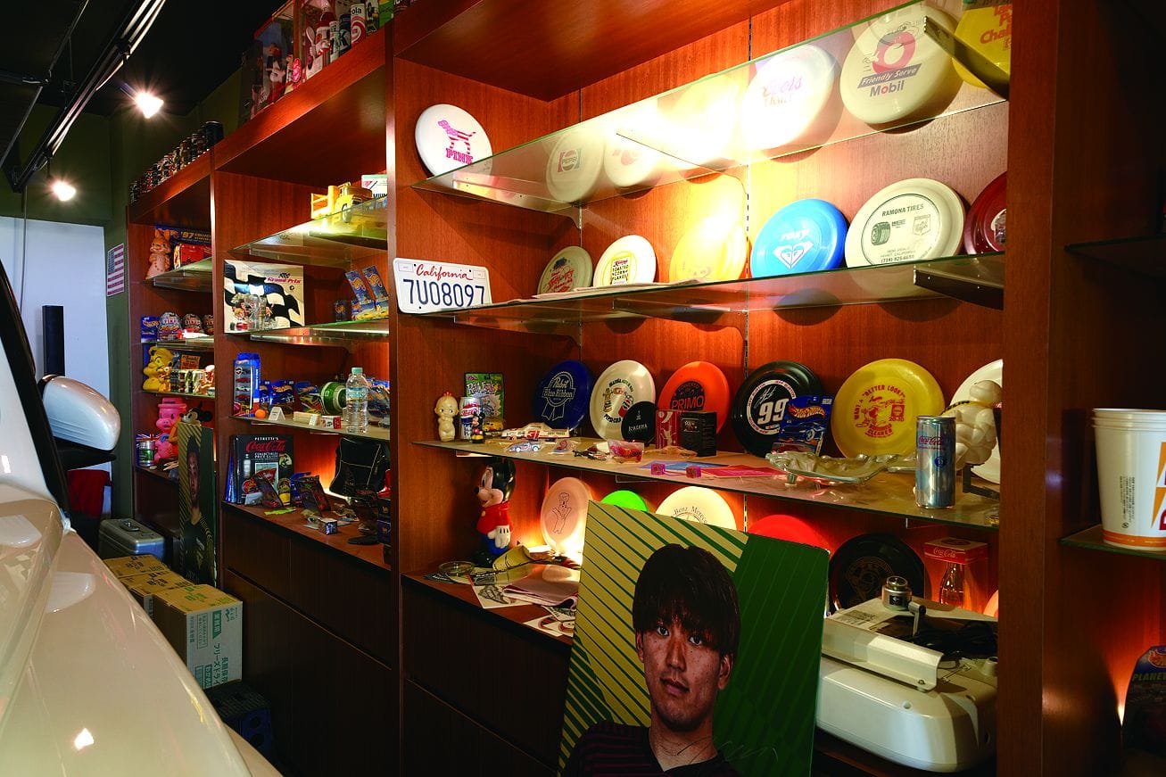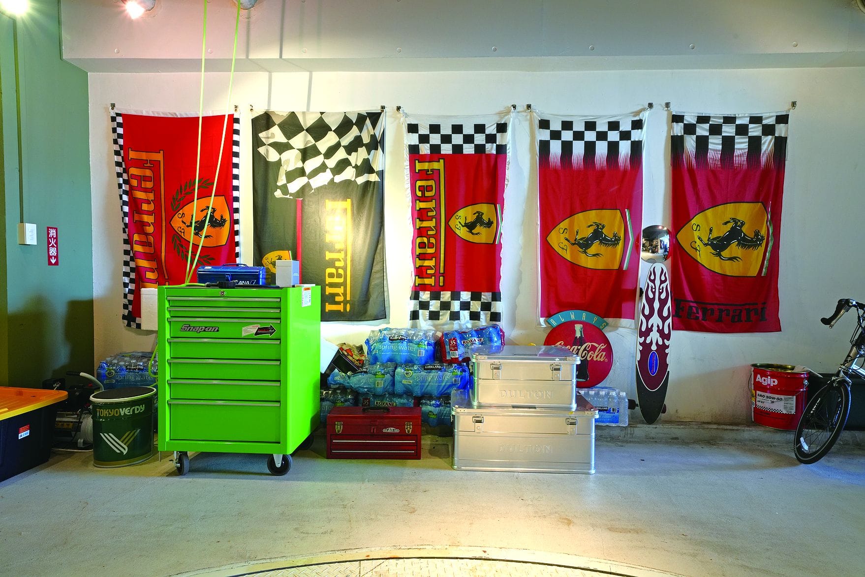 左/壁面にはフェラーリを所有していた頃の名残でフラッグが飾られている。ツールキャビネットなども用意されており、大まかな整備は行えるようになっている。 右/フリスビーやモデルカーなどのアメリカン雑貨コレクションは以前の取材時から変わりなく、特に増やしている感じでもないということ。
