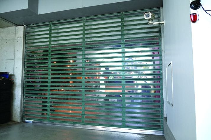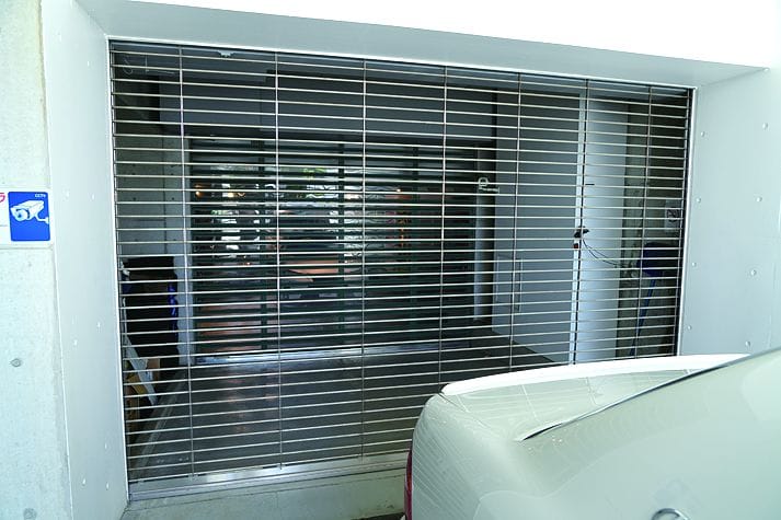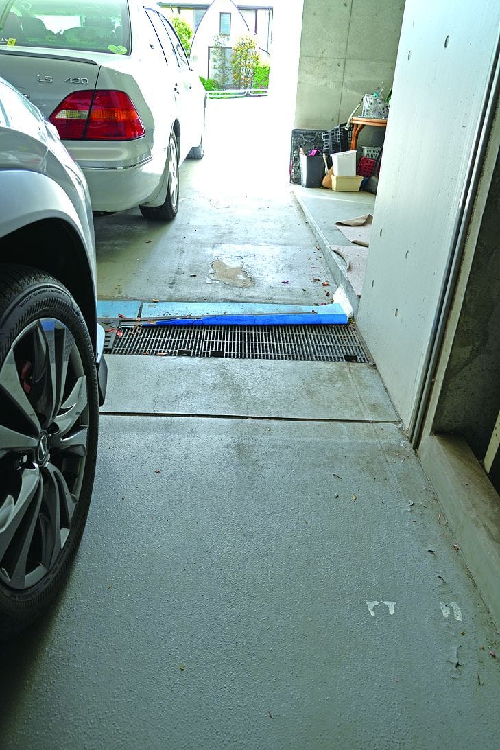 左/スケルトンパネルによりガレージ内が見えるシャッターをメインのガレージドアとしている。人の通用ドアもあれば良かったということ。 中/ガレージドアの前方にグリルシャッターも備え、セキュリティを2重としている。 右 /ガレージはビルの地下に位置しており、 ガレージに雨が浸入しないように排水溝は設けられ、そこに落ち葉などが入りこまないよう工夫がされている。