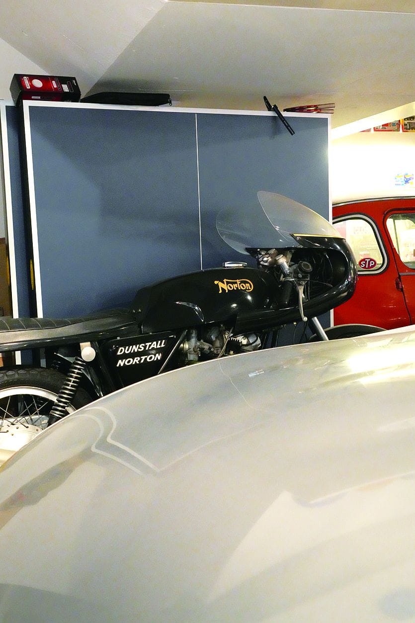 左/以前からガレージの仲間として存在しているノートンの奥には卓球台が見える。昔お子さんが卓球をしたいと用意したもので、それだけのスペースがあることが羨ましい。 右/ガレージの裏手はIさんのオフィスがあり、直接行き来することができる。しばしばクルマ好きの取引先などにガレージを見せるとか。