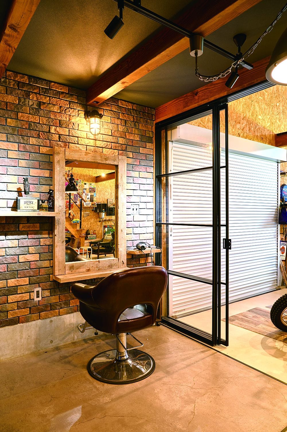 左/ガレージに使用されたペンダントライト、ハモサ製ランプ、マリンライトは施主の指定で購入したもの。ハモサ製コンプトンランプはヴィンテージ感たっぷり。 右/美容室が開業することもできるスペースの壁面は レンガタイル仕上げ。シャンプー台を設置すればハサミ 1 本でプライベートな美容室の開業が可能だ。