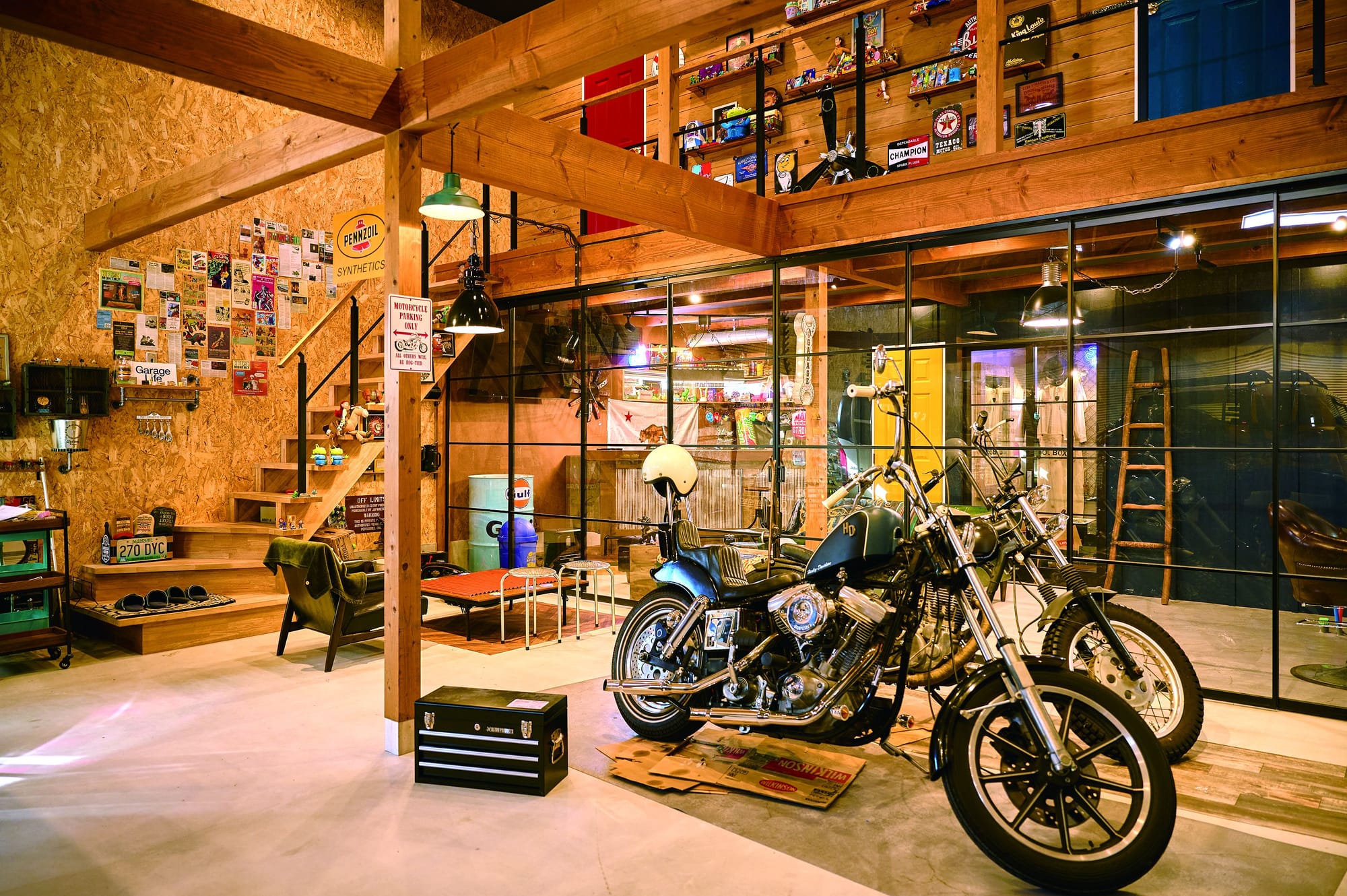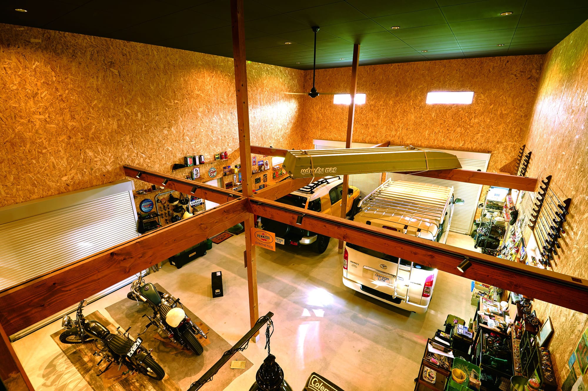 シンプルな外観から想像つかないガレージは、 夢が詰め込まれた宝箱