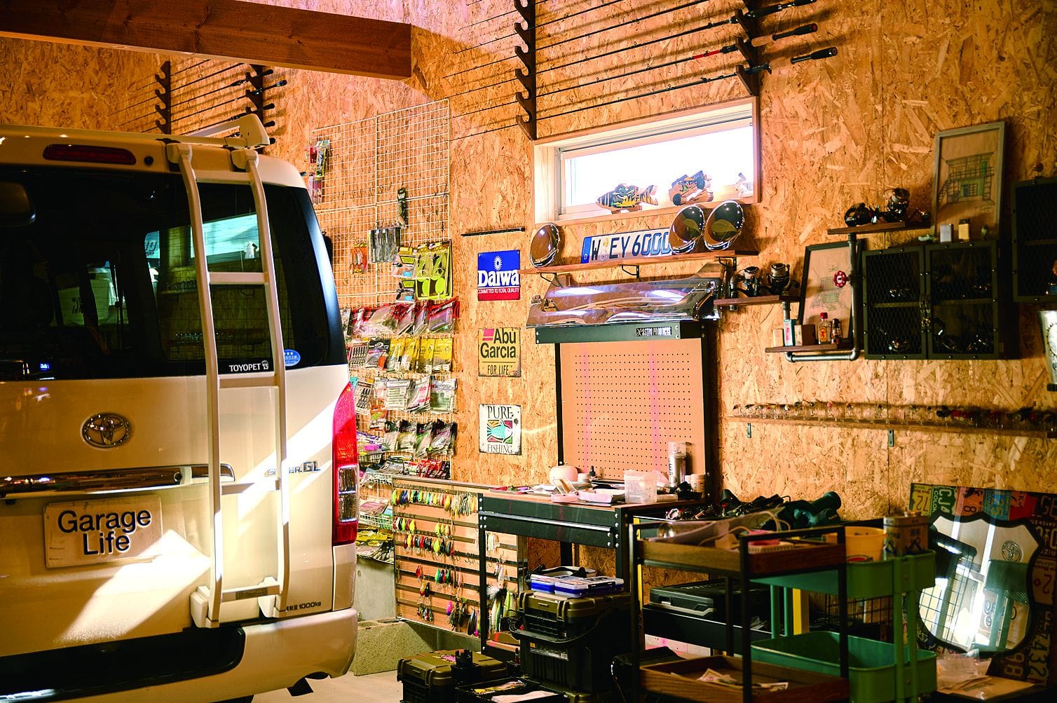 クルマが最大4 台入れることができるスペースはOSB 合板の壁面で仕上げられ、のちにHさんがDIY により棚を製作して趣味であるフィッシングアイテムやロッドを保管するスペースのほか、オートバイに乗るためのヘルメットや工具など収納する場所が確保された。またタチカワブラインド製の間仕切りにより美容のスペースと、リビングが設計されカウンター、トイレ、そして衣装が多いHさんのためのウォークインクローゼットを用意して趣味を謳歌できる場所が用意された。