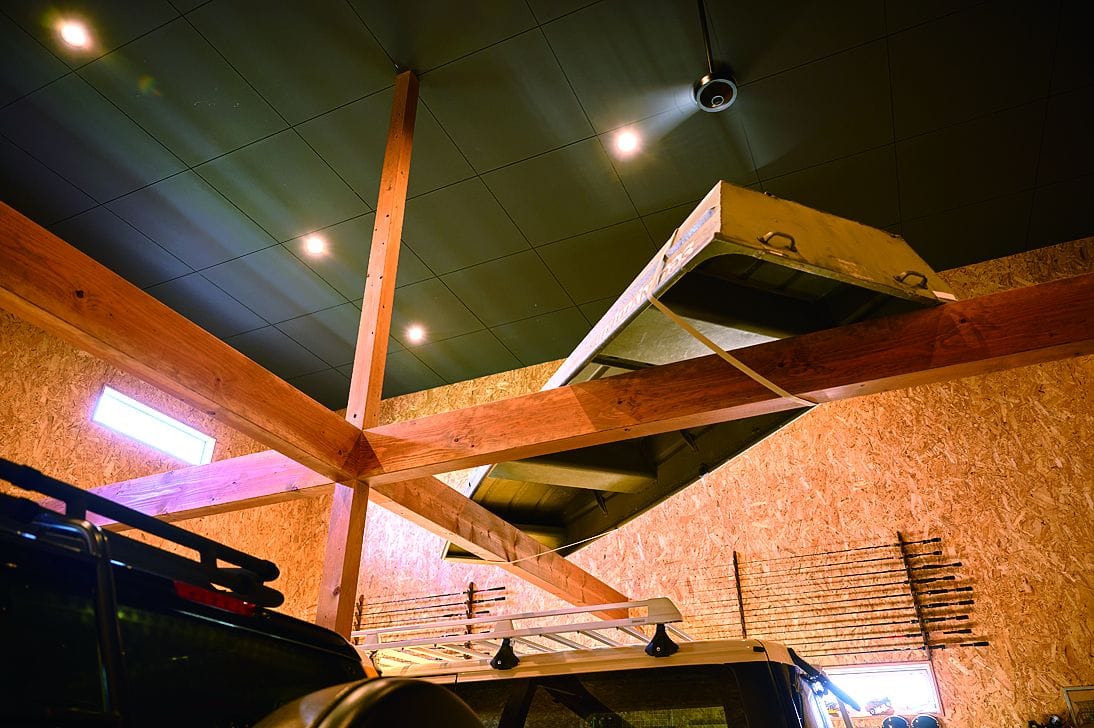 木造建築ならではの梁と柱を活かして、デザインを楽しめるガレージ。