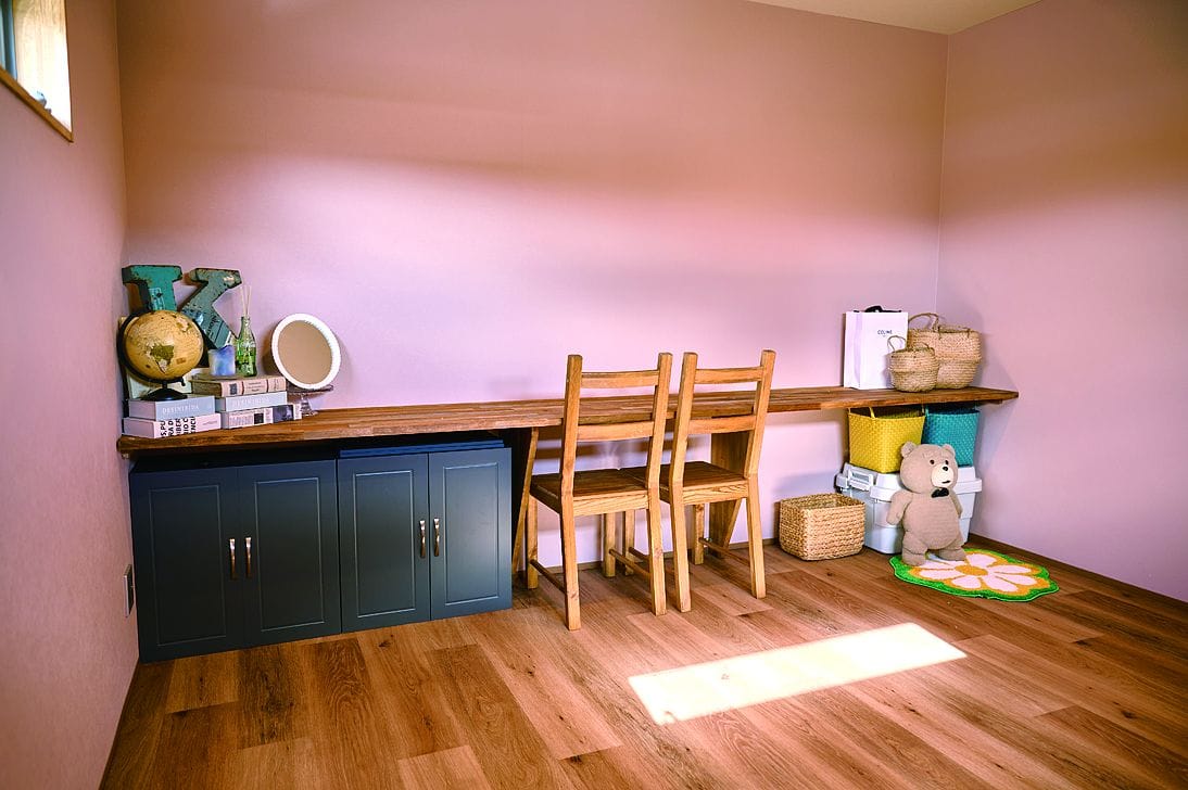 また2 階には約10㎡の居室スペースが用意され、主寝室としても使用が可能なスペースが用意された。実際には隣に母屋があり寝室はいらないため、現在は奥様の部屋として利用するなど自由なスペースとして使用できるようになっている。カラフルな木製のドアが印象的な部屋となっている。ガレージを見下ろすことができる廊下は、またHさんが欲しかったコレクションを展示するスペース。将来はガレージの梁を使って増築して部屋も拡張できるなど、可能性を残しているなど魅力的なガレージとなった。