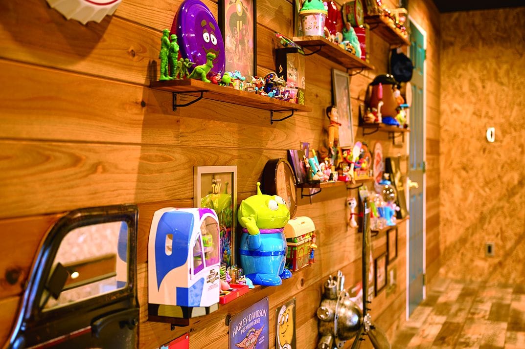 左/ホームセンターに出向いて道具を揃えて、DIYにて作業をして造作した棚。オートバイを磨くためのケミカルや油脂類が保管されるほかアウトドアグッズも収納できるスペース。 右/ 2 階の廊下に用意された棚は、アメカジのアイテム、雑貨、フィギュアがディスプレイ。アメリカン雑貨ショップに行くのも楽しみの1 つ。