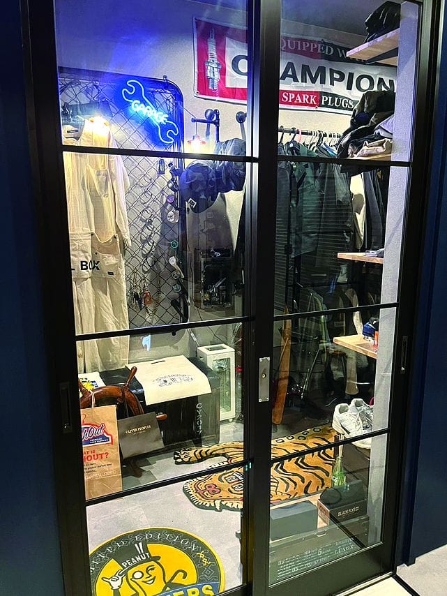 アメリカンヴィンテージの臭いが漂う、クルマとオートバイ、アメリカントイなど遊ぶアイテムが詰まったガレージは、将来、美容室も開業できる夢のスペースだった。