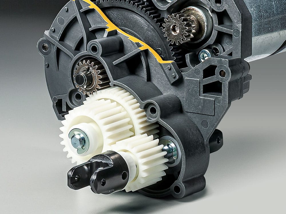 部分的に金属パーツで補強したラダーフレームのシャーシに前後とも4リンクリジットサスペンションで本格クロカン仕様に仕上げられているCC-02シャーシを採用。付属ギアの組み換えのほか、別売ギアで20種類の幅広いギア比でのセッティングが可能。