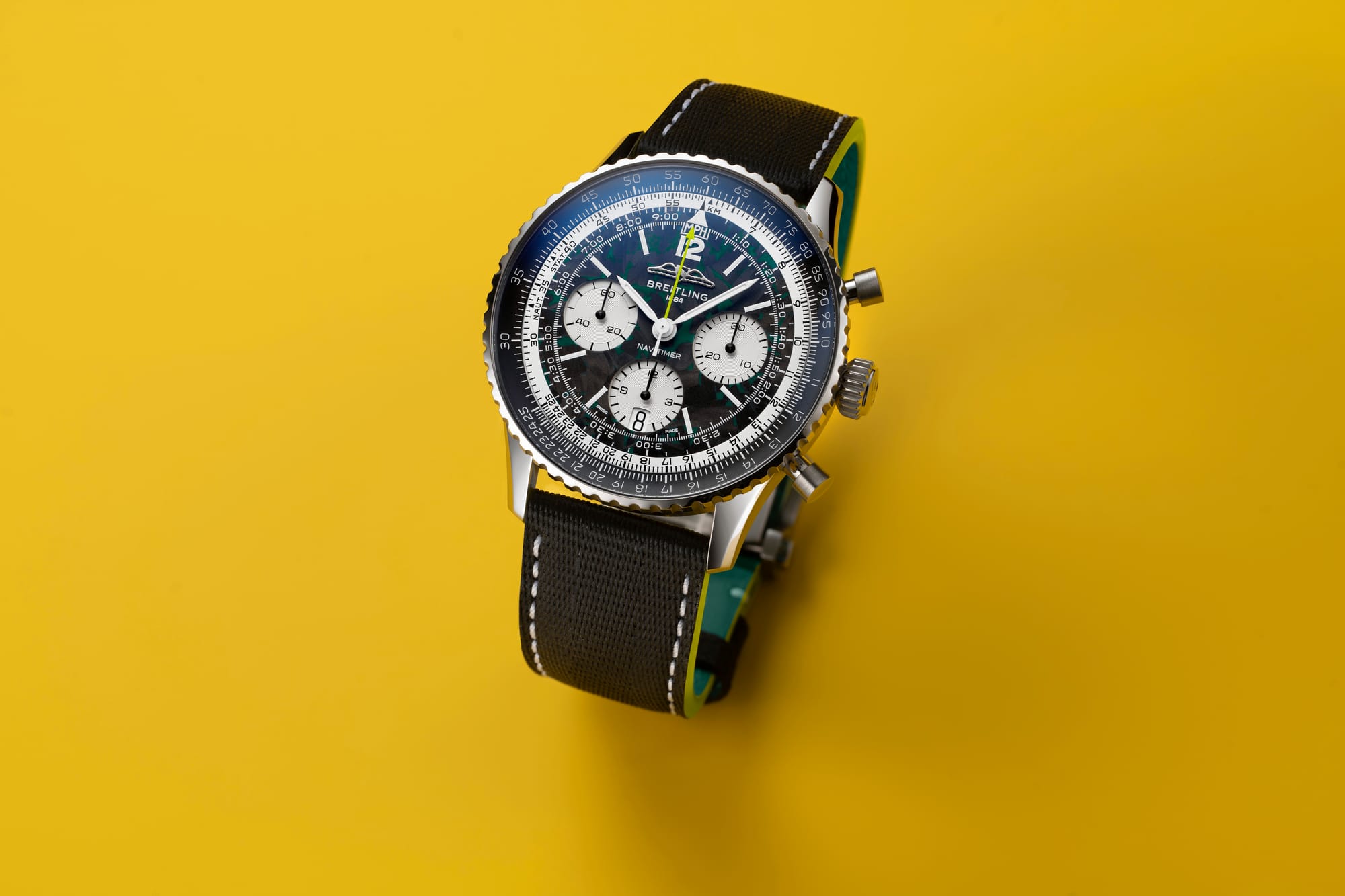 そして、今回のパートナーシップによる初のコラボウォッチ、「BREITLINGナビタイマーB01クロノグラフ43ASTON MARTIN ARAMCO FORMULA ONE™ TEAM」が、アストンマーティンがF1初出場を果たした1959年にちなんで1959本限定で発売(税込156万2000円)。アストンマーティン・アラムコの外装デザインに着想を得たアストンマーティン・レーシンググリーンとライムのアクセント、ナビタイマー初採用という軽量チタン製ケース、そして F1マシンのコックピットに用いられる素材からインスピレーションを得たカーボンファイバー製ダイヤルを採用。型押しを施したレザーストラップはレーシングハーネスを想起させる。