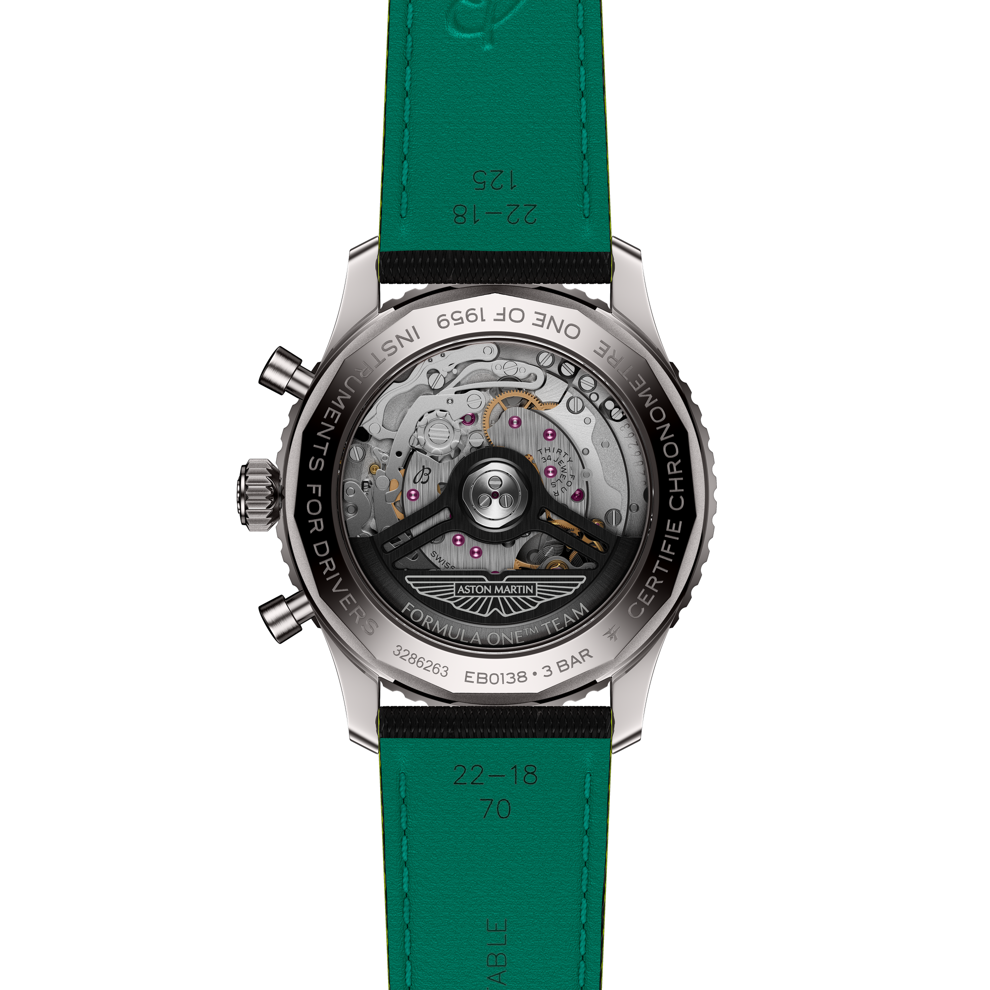 COSC認定クロノメーターで約70時間のパワーリザーブを備えた「ブライトリング マニュファクチュール キャリバー 01」ムーブメントを搭載。高耐久性PVD(物理蒸着法)でコーティングされたタングステン製で、このエディションのために特別に開発されたマットブラックのローターには、「ASTON MARTIN FORMULA ONE™ TEAM」のロゴを、ケースバックには「One of 1959」と「Instruments for Drivers」のワードが刻印されている。