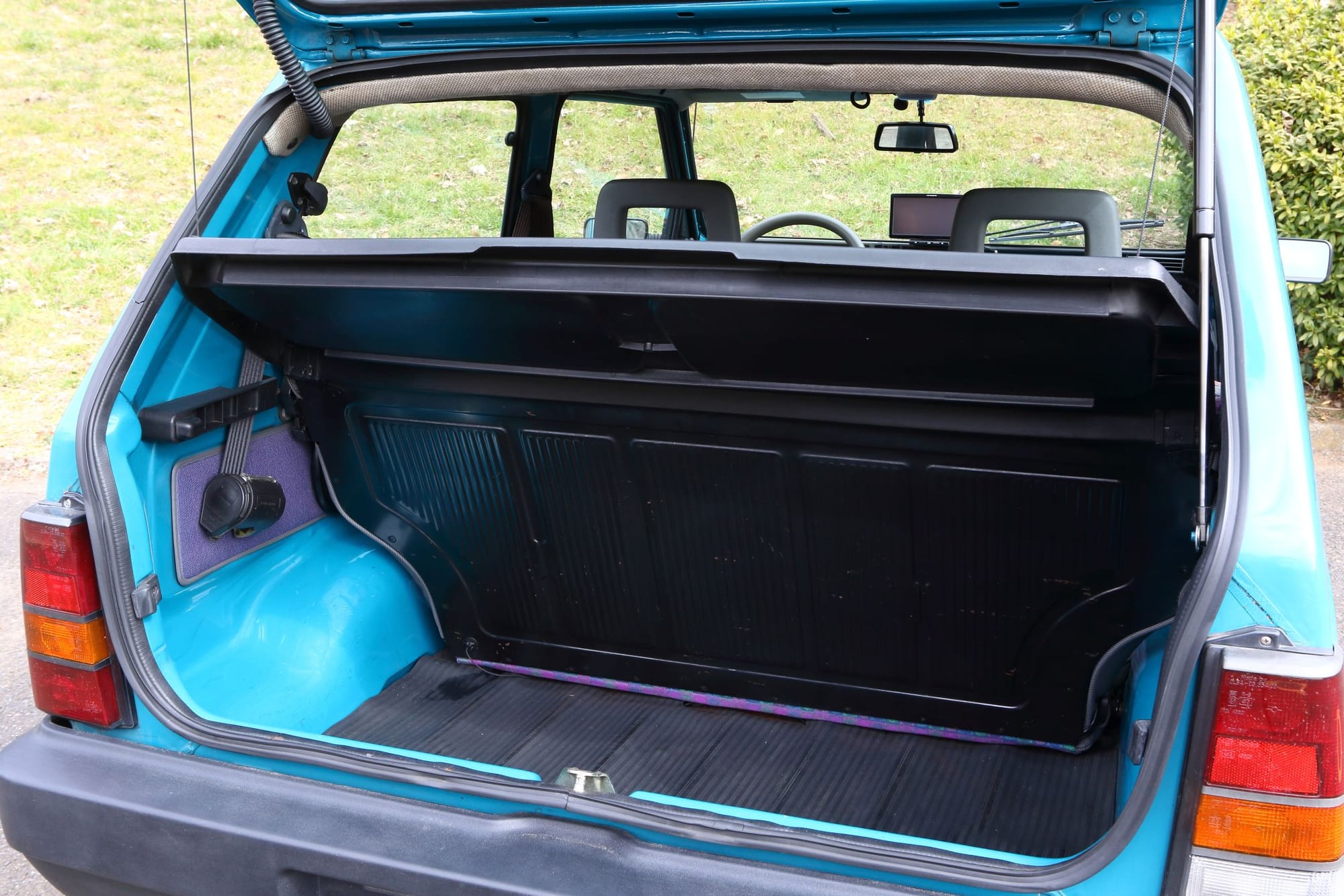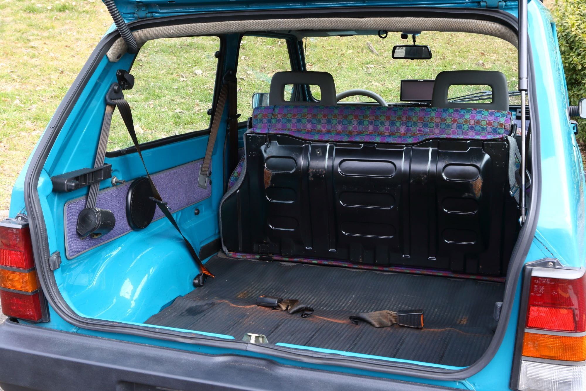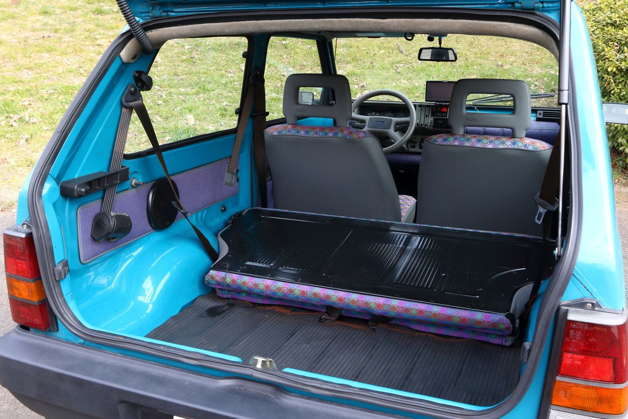 通常状態でもトランクスペースは意外に広いが、バックレストを倒せば大きな物も搭載可能。更にダブルフォールディングさせれば広大になる。後席は左右に3点式ベルトを装備する。