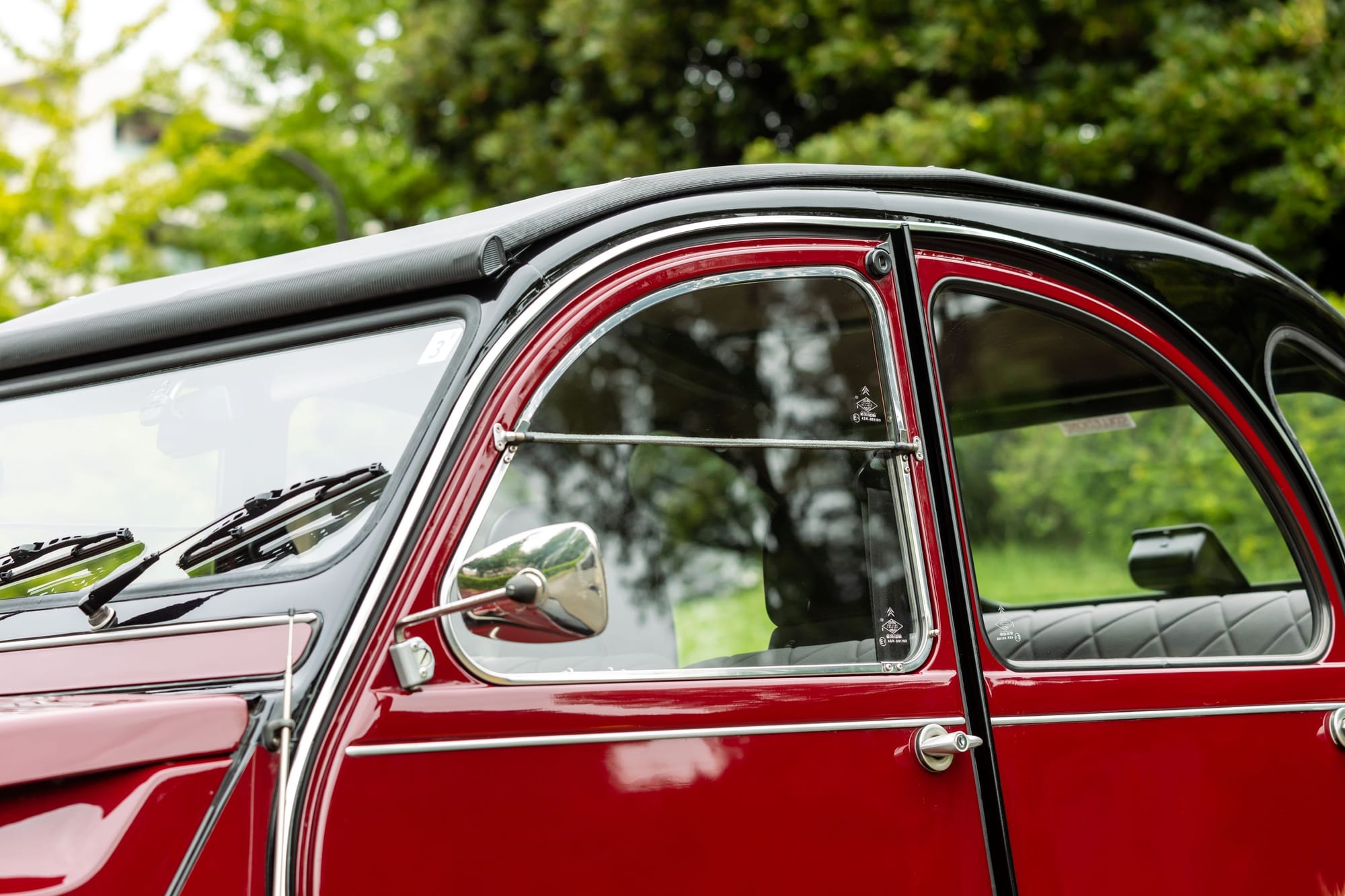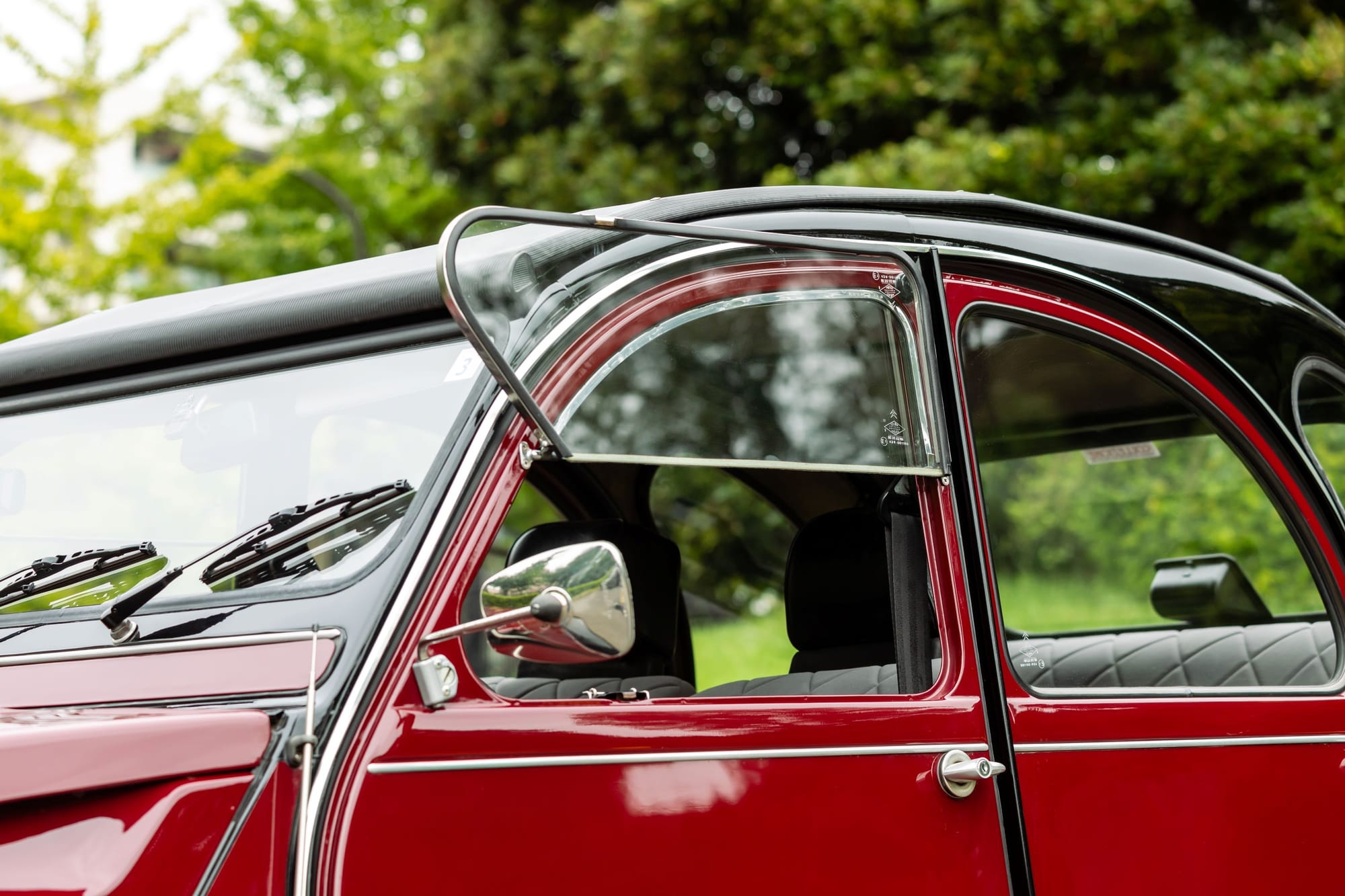 サイドウインドーは前ドアのみ開閉が可能。巻き上げ式ではなく、下側半分が外に開く形式。左が閉じた状態。中は僅かに開けた状態で、金具によりこの位置で固定できる。右は全開状態。強く開くと固定される。