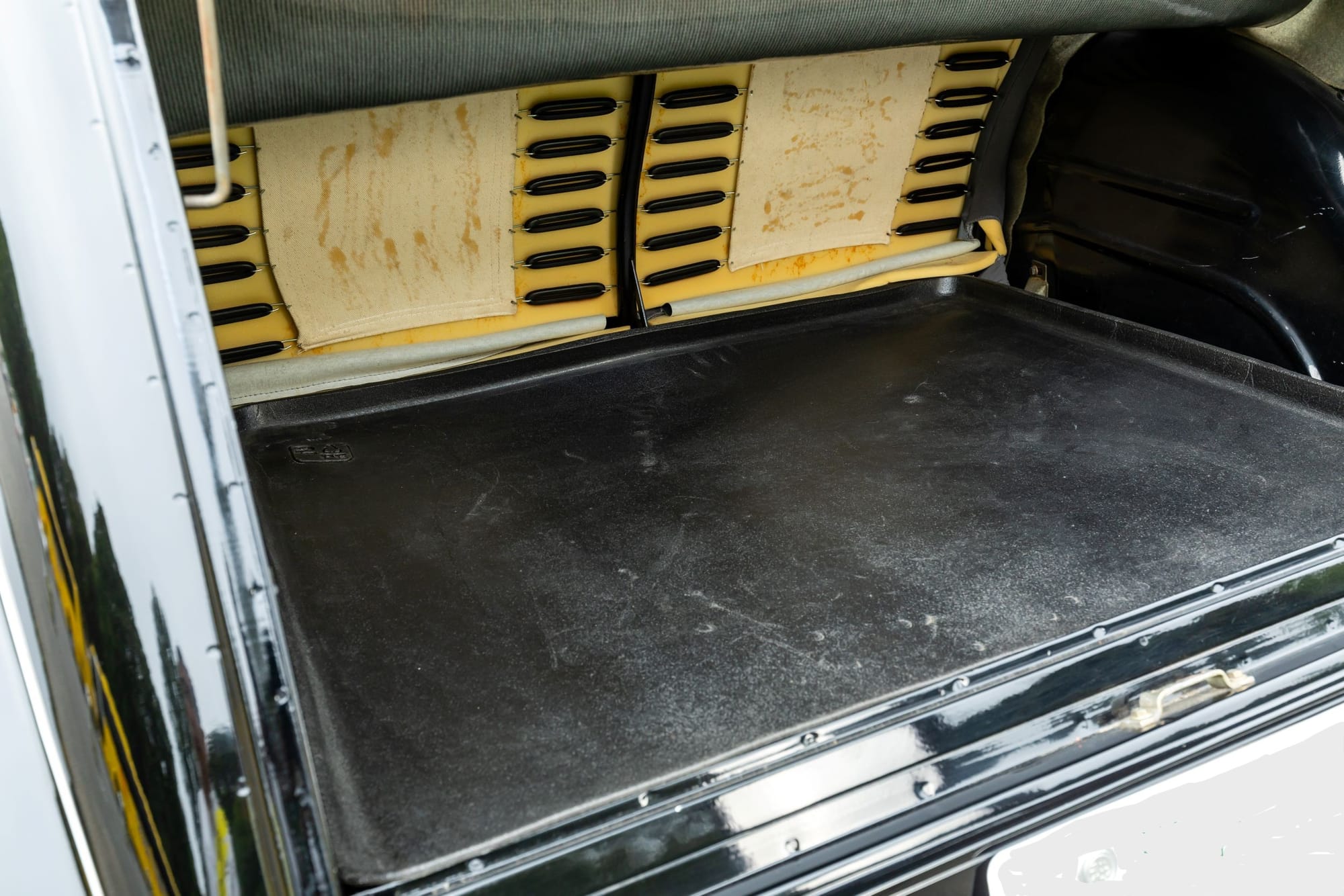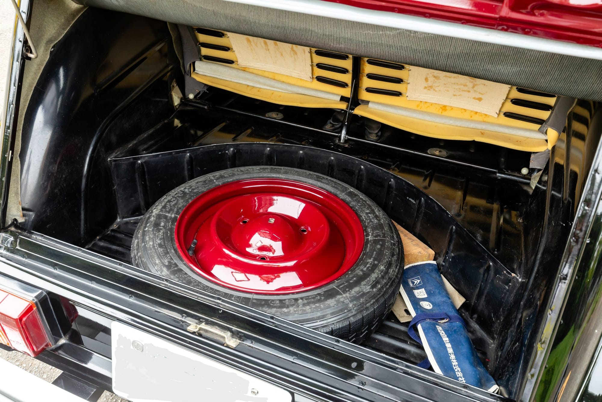 ラゲッジスペースは意外に広い。現車はトレイを置いているため、フラットで使いやすい。後席シートバックが新品のようだ。トレイの下にはスペアタイヤやジャッキが収納されている。