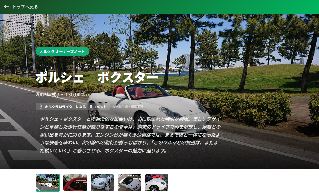 オーナーズノートは、愛車について自由に書ける、シンプルなノートであり、雑誌記事の1ページのように他の人に読んでいただいたりできるもの。購入のきっかけ、印象に残っているドライブ、気に入っているところ、ちょっと手のかかるところ。などなど……、上手な文章である必要はありません。クルマとどう付き合ってきたかを、自分の言葉で残すだけ。あとはAIがサポートして記事化して行きます。クルマを“モノ”としてではなく、時間を共有してきた存在として見直す。オーナーズノートは、そのための入り口です。