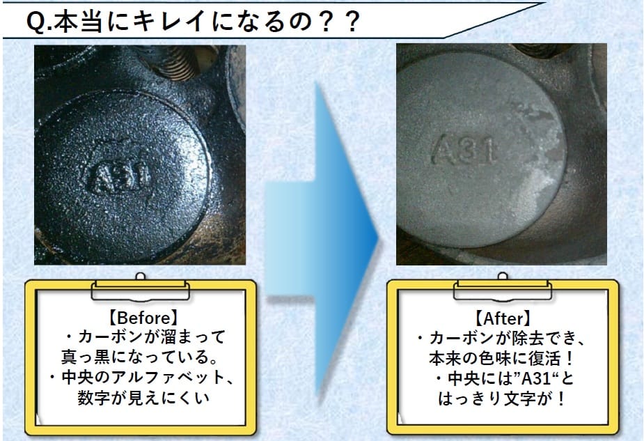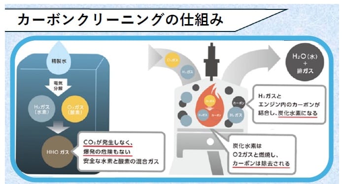 水素をエアクリーナーから注入して燃焼室に付着しているカーボンを酸水素で燃やし切る仕組みで、燃やし切ったカーボンは排気ガスとともに排出されるのだ。クルマにやさしい天然由来の成分を使って、エンジンを分解することなく施工は30~60分程度。