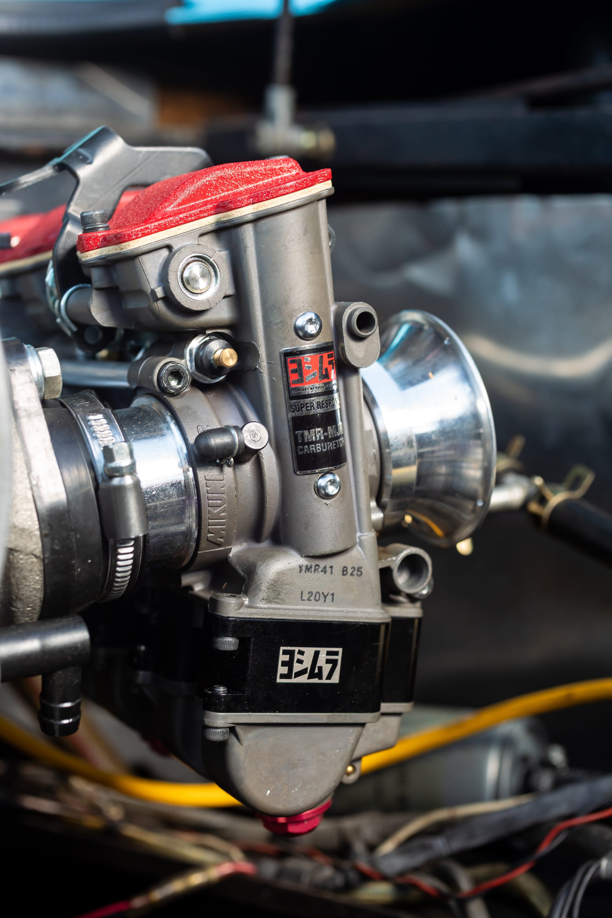 もうひとつのアイテムは「ヨシムラ4輪用TMR-MJNキャブレター」。その名の通り、ヨシムラが長年にわたり磨き上げてきたバイク用キャブレター技術を4輪に最適化したものだ。キャブに対し主に垂直方向にGがかかるバイクとは異なりクルマでは横Gにより生じる燃料オーバーフローや油面暴れを抑制するディープフロートを専用開発。全体のサイズは非常にコンパクトで、スロットルにはスライドバルブを用いているので、レスポンスの良い吸気と心地良いサウンドを両立している。