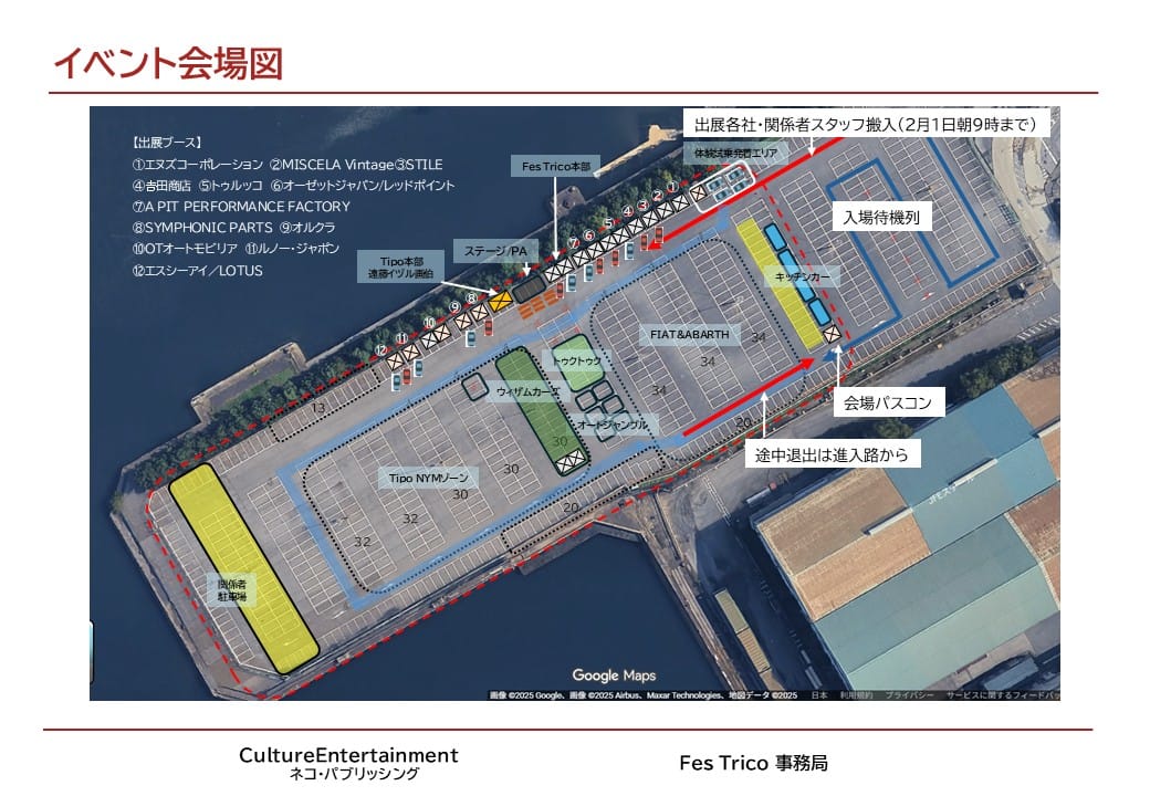 会場オープンは朝8時を予定しています。入場ゲートがありますので、「Tipoニューイヤーミーティング」「CIAO! FesTrico」のチケット画面を提示してスタッフの誘導に従って進んでください。おかげさまで大変多くのエントリーがありましたので、くれぐれも会場内は徐行でお願いしますね。