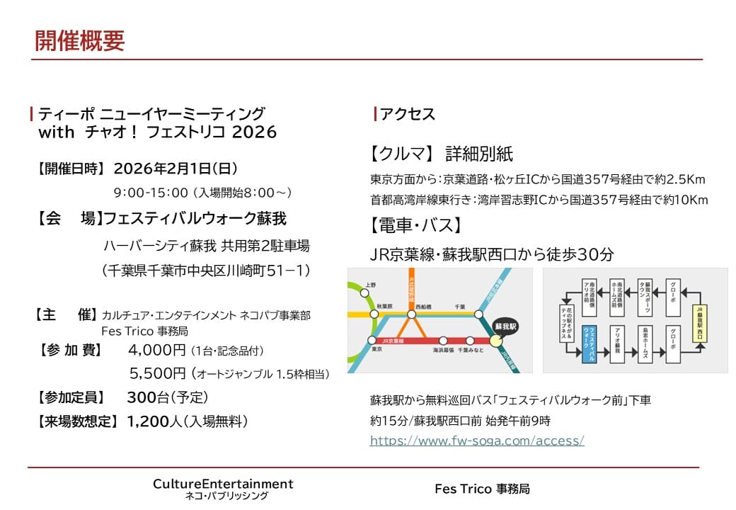 年始からバタバタとしてしまって情報更新が滞っておりました、2月1日(日)にフェスティバルウォーク蘇我で開催します、Tipoニューイヤーミーティングwith CIAO! FesTrico 2026の概要であります。イベントは入場無料ですが会場には参加チケットを申し込んでいただいたクルマだけが入場できます。見学の方は公共交通機関もしくはフェスティバルウォーク蘇我・ハーバーシティ蘇我の駐車場をお使いください。また、著しい積雪や悪天候などでの開催中止につきましては、1月30日(金)にお申込みいただいたメアドにその旨をお送りするほか、ここTipo WEBとFesTricoおよびSNS等でお知らせします。